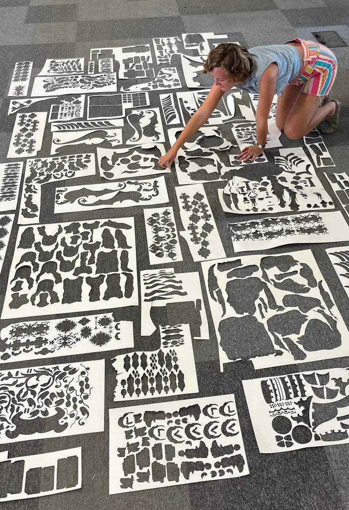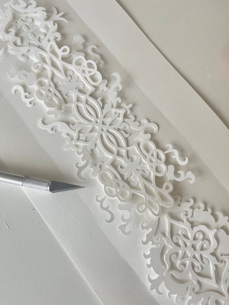 Once those final scaled concept drawings are approved, I get to making! I have a team of freelance assistants who I work with on rotation, depending on the project and skills required, and for big film sets or window installations I collaborate with construction companies; the smaller personal projects I do by myself. Project depending, it’ll be a combo of drawing, cutting, gluing and assembling things fully by hand, with some finer details or repeat patterns cut on my trusty plotter machine, all drawn as vector files.