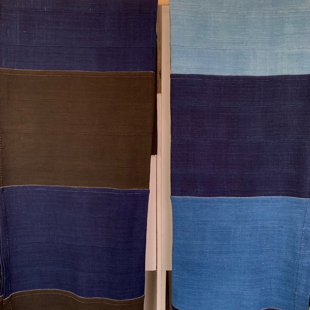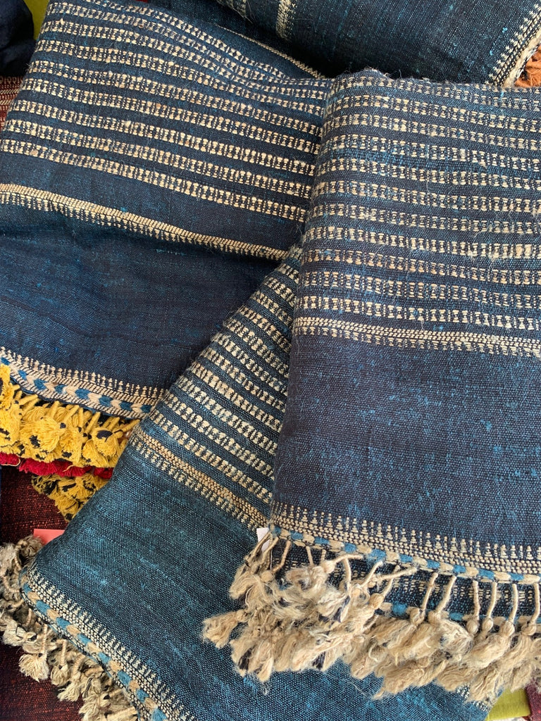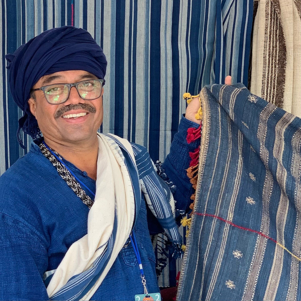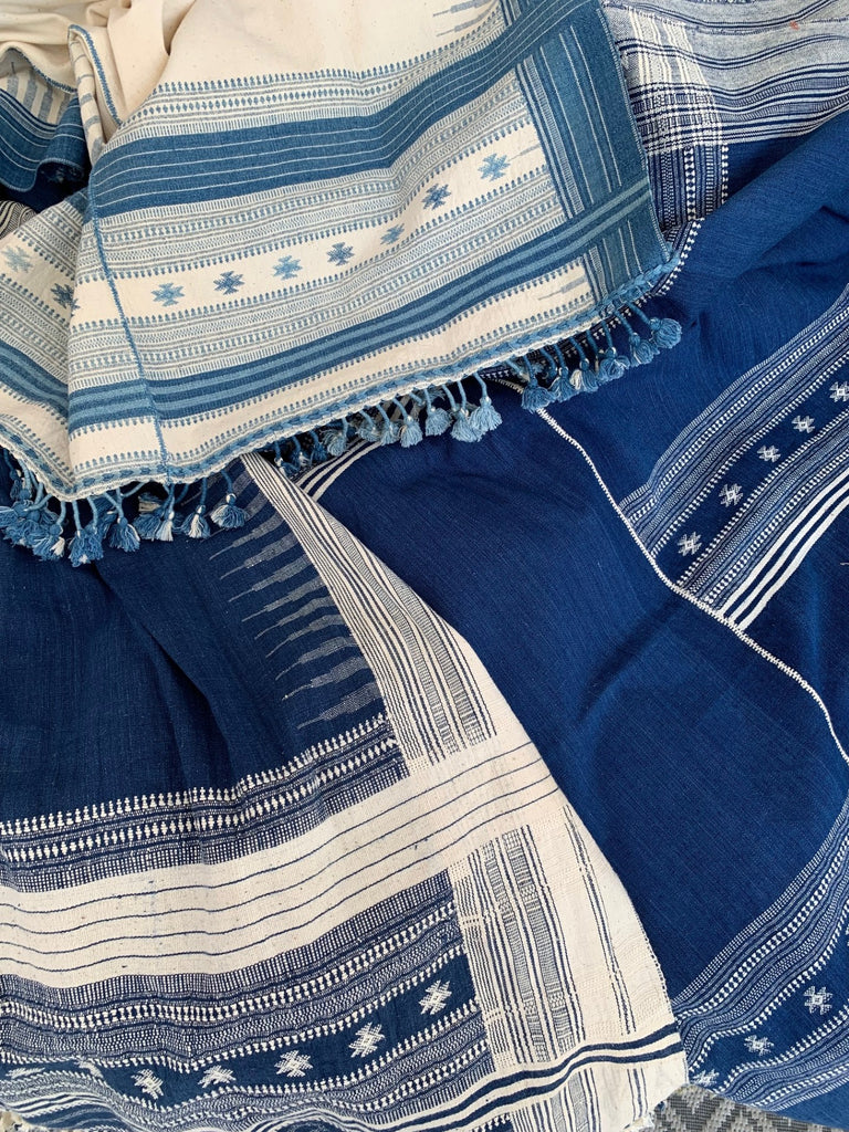 Today, Shamji is a master weaver, specializing in interlock weaving with patterns from extra-weft weave, all of hand spun, hand loomed, hand dyed cotton. He is considered India’s master indigo dyer, as witnessed in the impeccable shawls and bedspreads he creates, among the ultimate handwoven textiles of modern times.