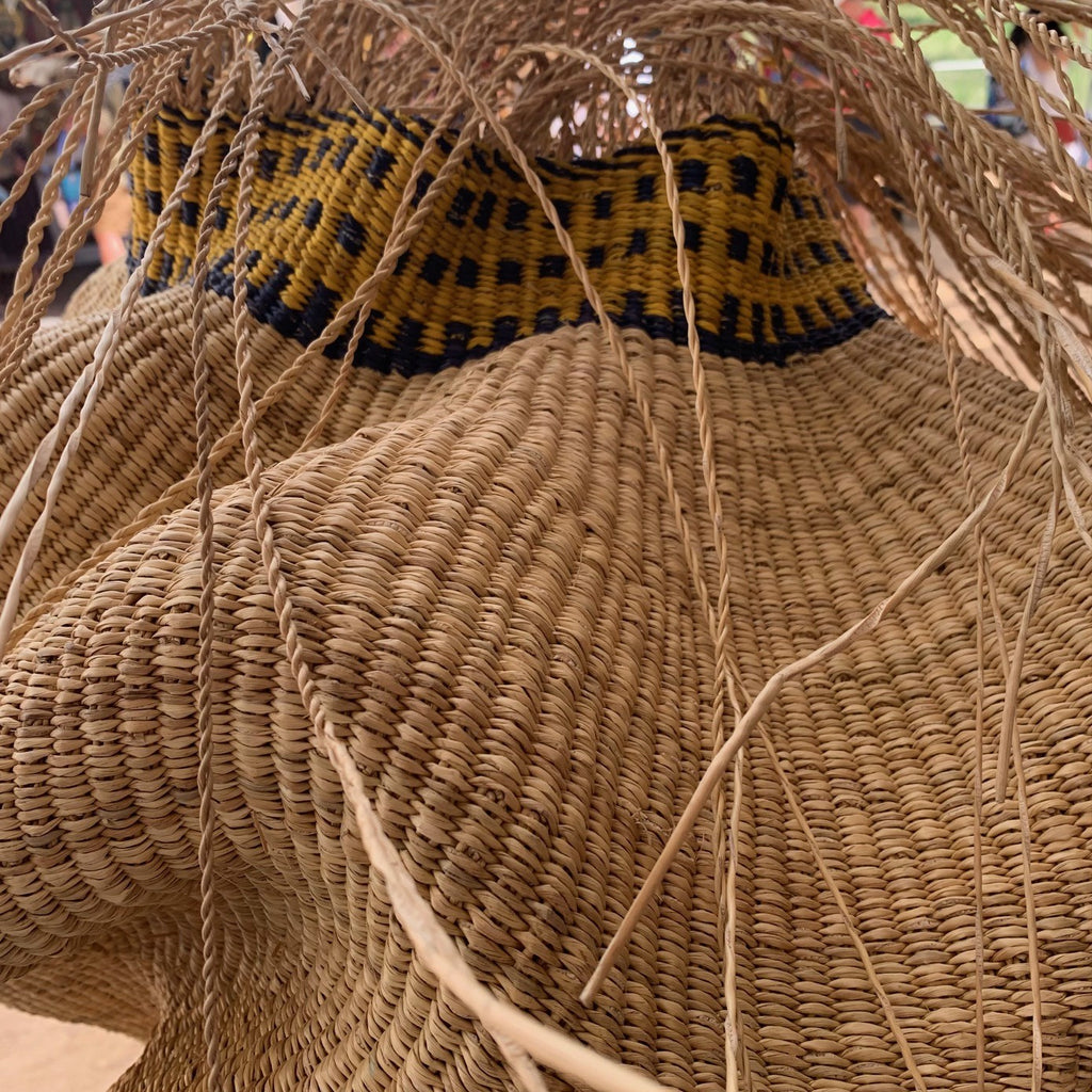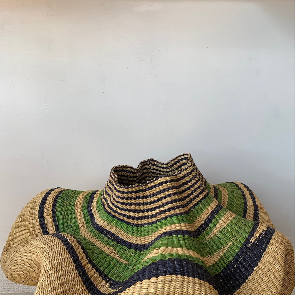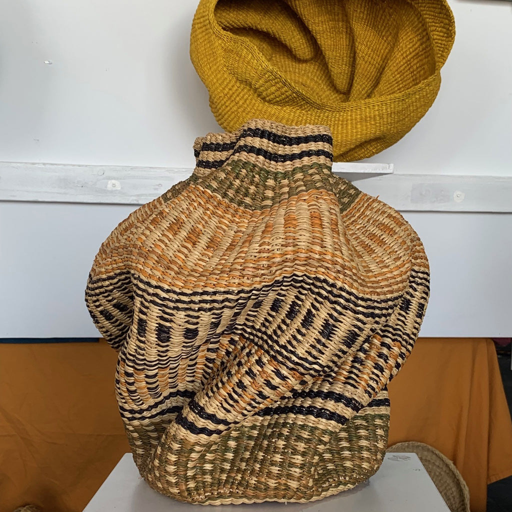 Baskets can blow one’s mind, when one considers they are probably the earliest craft forms— and especially when one discovers the sculptural basketry of Nanasei Agyemang! In the barren lands of Ghana’s Upper East Region, Nanasei found a way to naturally dye durable elephant grass, which has been hand-harvested and hand-split. Water softens the grasses, allowing them to be shaped into magnificent organic sculptures, truly expressions of wonder and surprise. With their fresh geometric patterning and sprays of loose fibers, they exist in the realm of contemporary art.