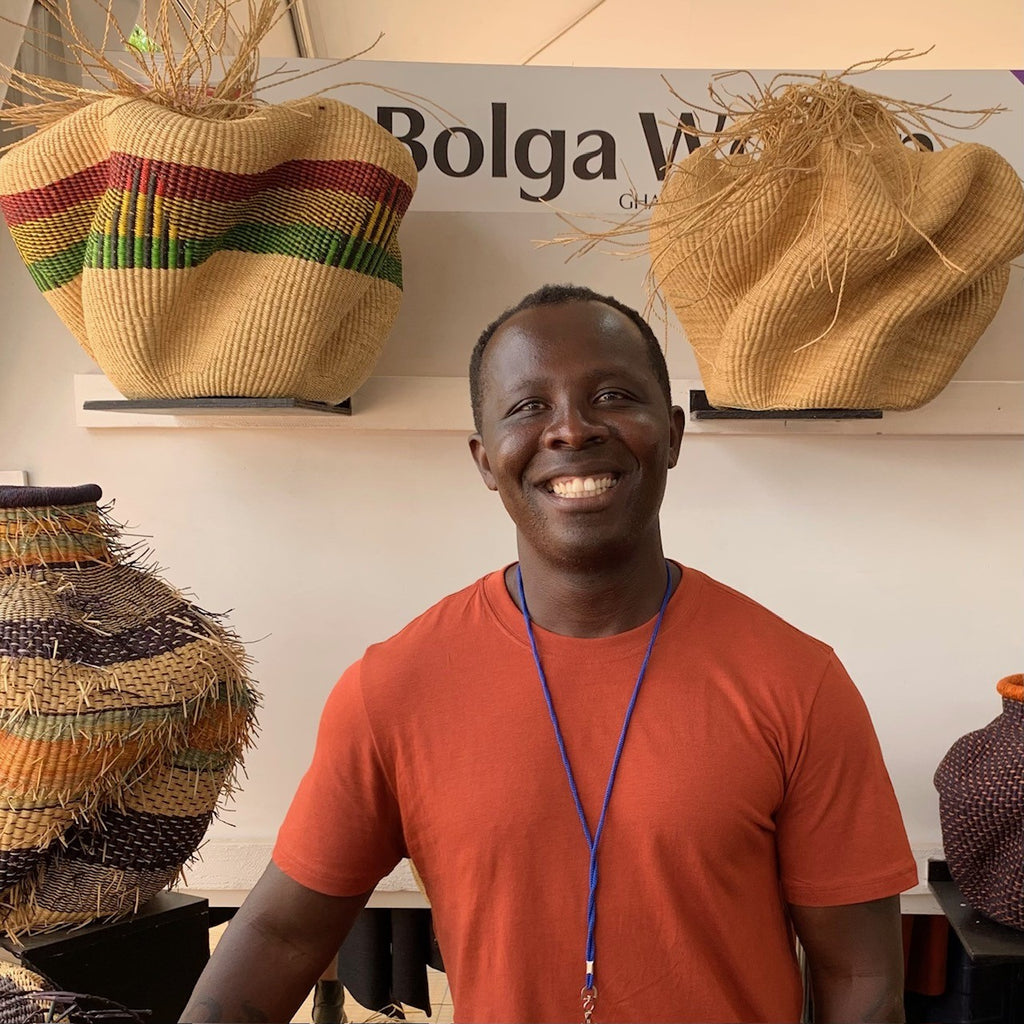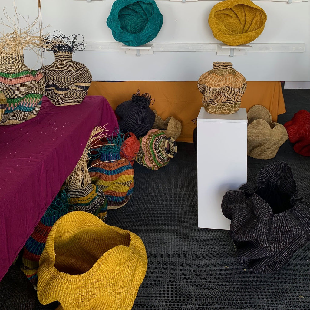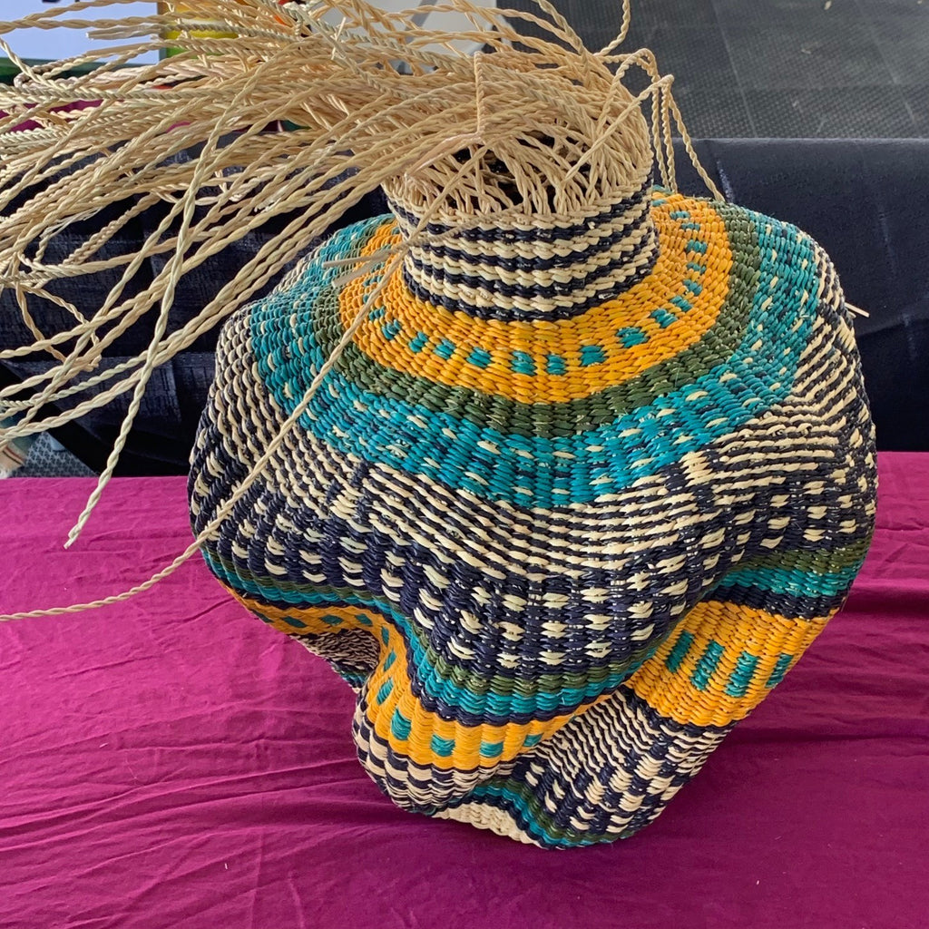 Baskets can blow one’s mind, when one considers they are probably the earliest craft forms— and especially when one discovers the sculptural basketry of Nanasei Agyemang! In the barren lands of Ghana’s Upper East Region, Nanasei found a way to naturally dye durable elephant grass, which has been hand-harvested and hand-split. Water softens the grasses, allowing them to be shaped into magnificent organic sculptures, truly expressions of wonder and surprise. With their fresh geometric patterning and sprays of loose fibers, they exist in the realm of contemporary art.