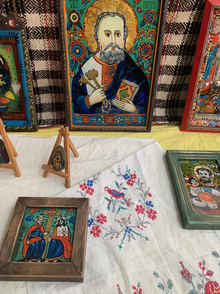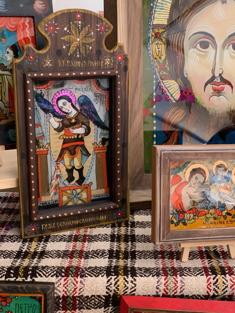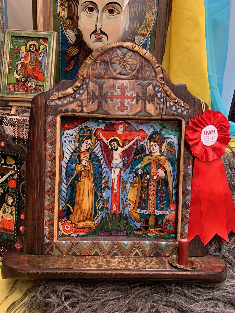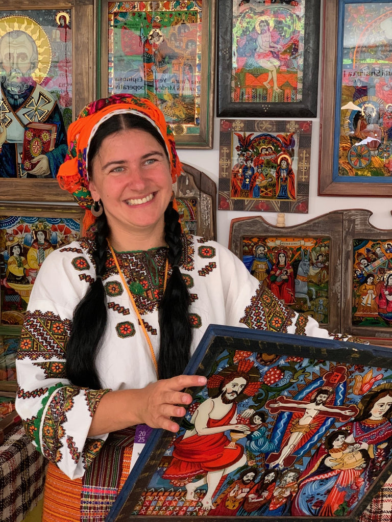 Transcending time and place, Tetyana Skoromna transforms her rich cultural heritage and classic techniques into contemporary works rooted in Ukrainian folk art. Specializing in reverse glass painting, Skoromna is a master of encaustic painting, employing a mixed media of animal glue, beeswax, egg tempera and soot, creating mash-ups of folk iconography from different ethnic groups such as the Galicians, Hutsuls, Slobozhans and Bukovinians. Her mission to preserve and showcase Ukraine’s artistic legacy, combined with her inventive artistic approach, earned her an IFAM Innovation Award.