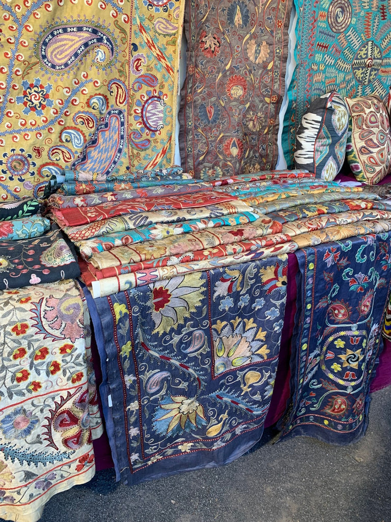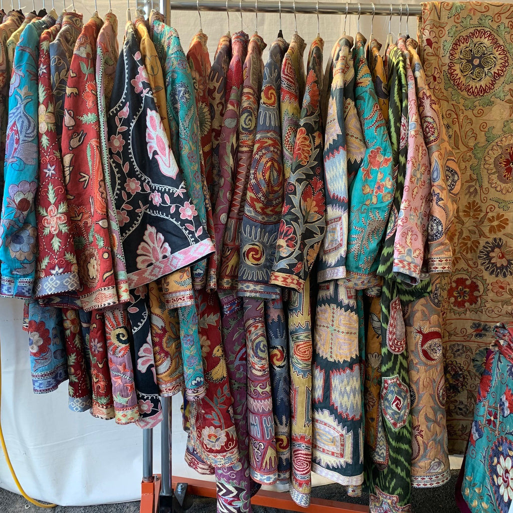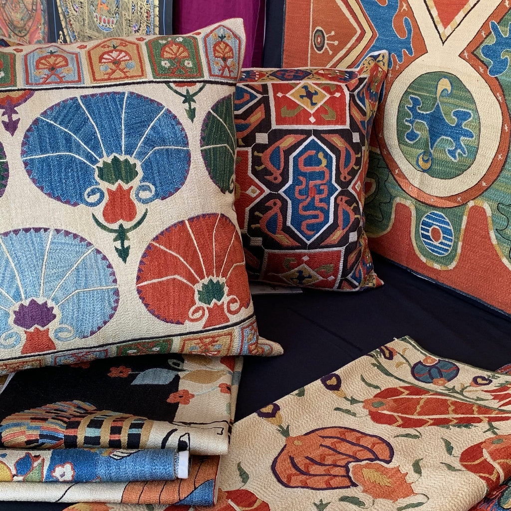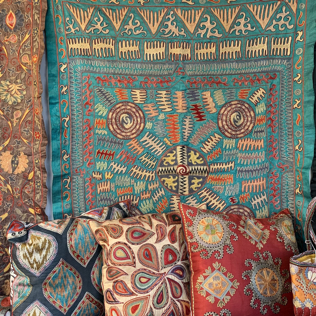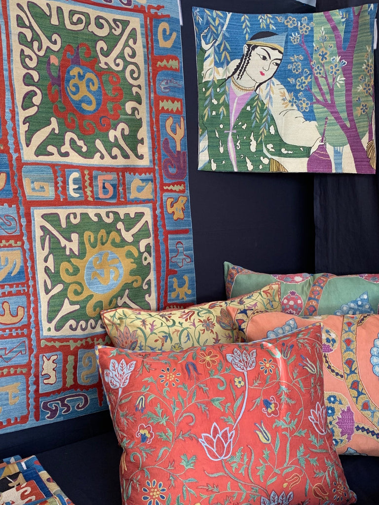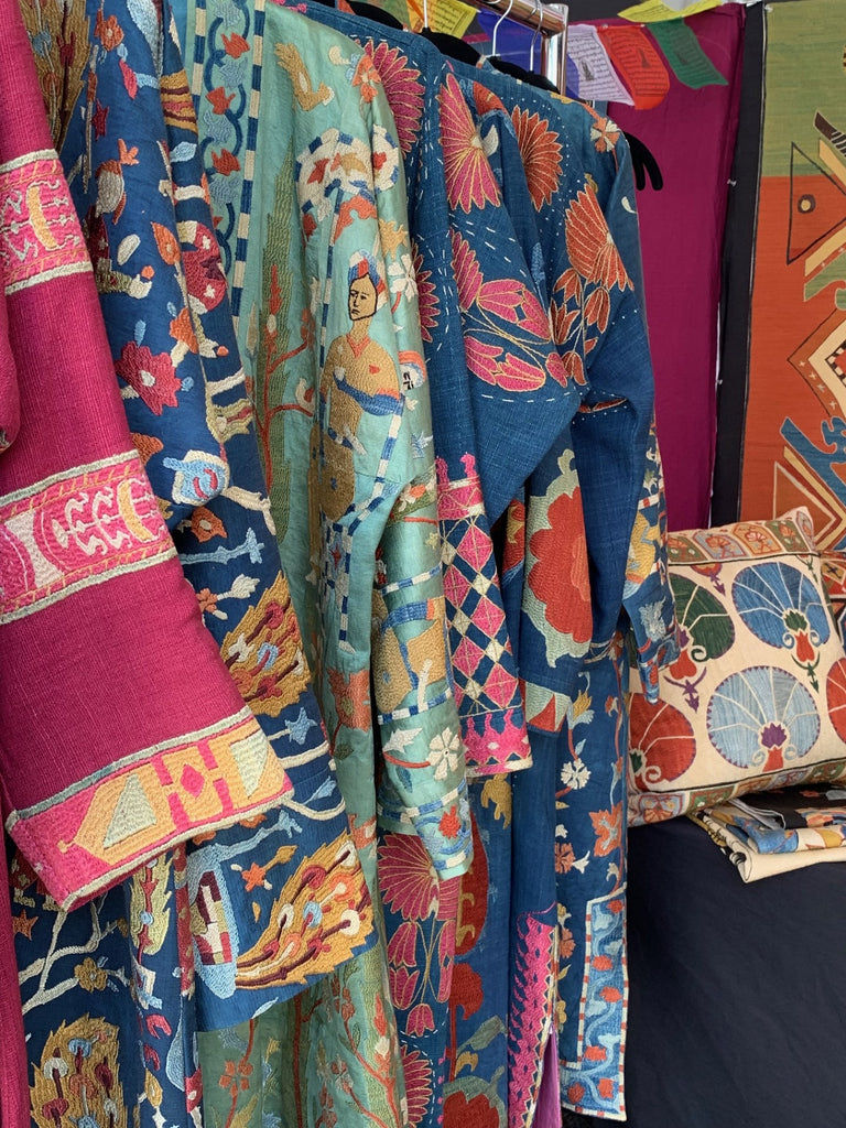 Imagine the boiled down essence of pomegranates, apricot peels, rose petals, saffron, nutshells and madder root coloring some of the loveliest suzanis available. It is to be transported to the Silk Road city of Bukhara, and the wonders of the rich embroideries of Sanjar Nazarov, the third generation master embroiderer working there with his family workshop. Suzani is the Farsi word for embroidery, and its creation begins with the birth of a baby girl, to be enjoyed later on her marriage bed. These splendid suzani pillows and bed covering and marvelous coats and accessories reflect design motifs of the Lakai people of Uzbekistan. One can sense how passionate Iris Appel would have felt about these.