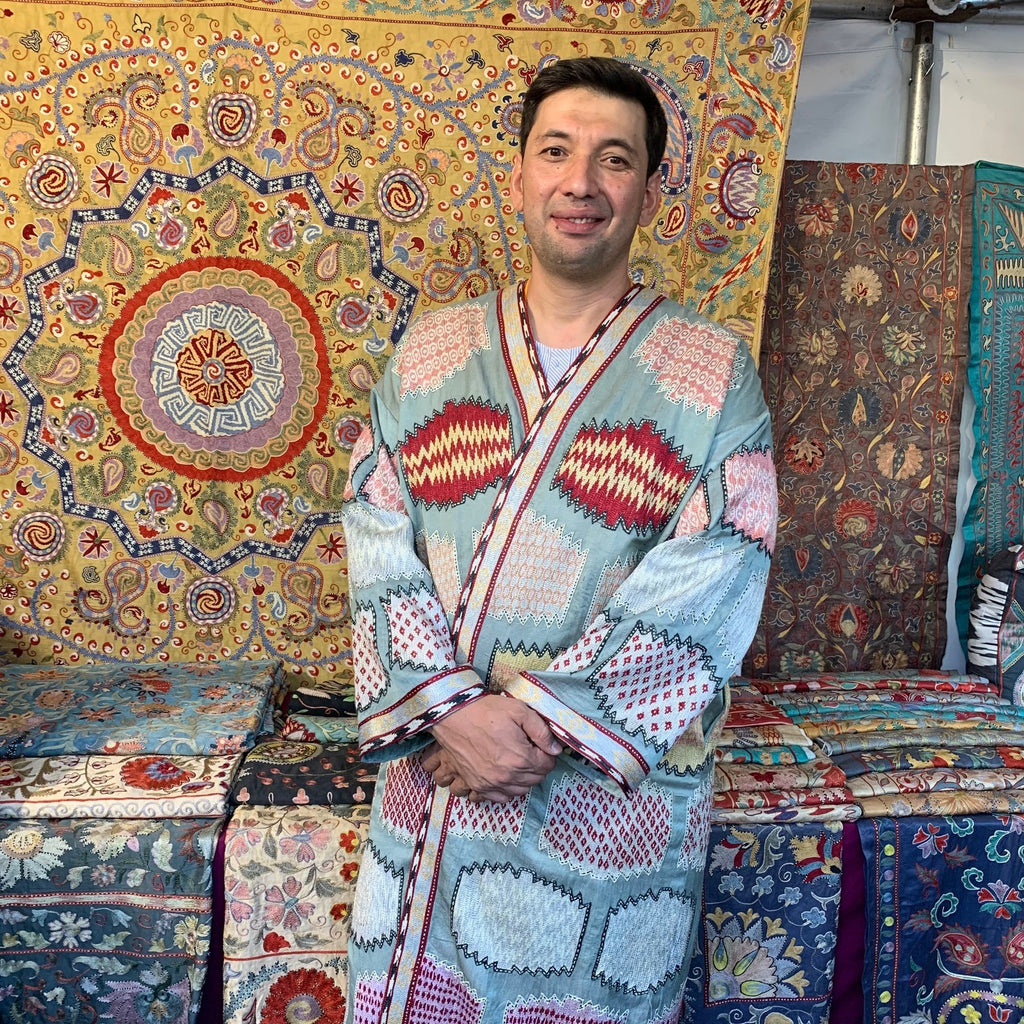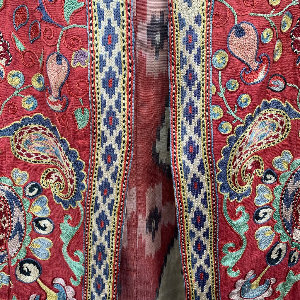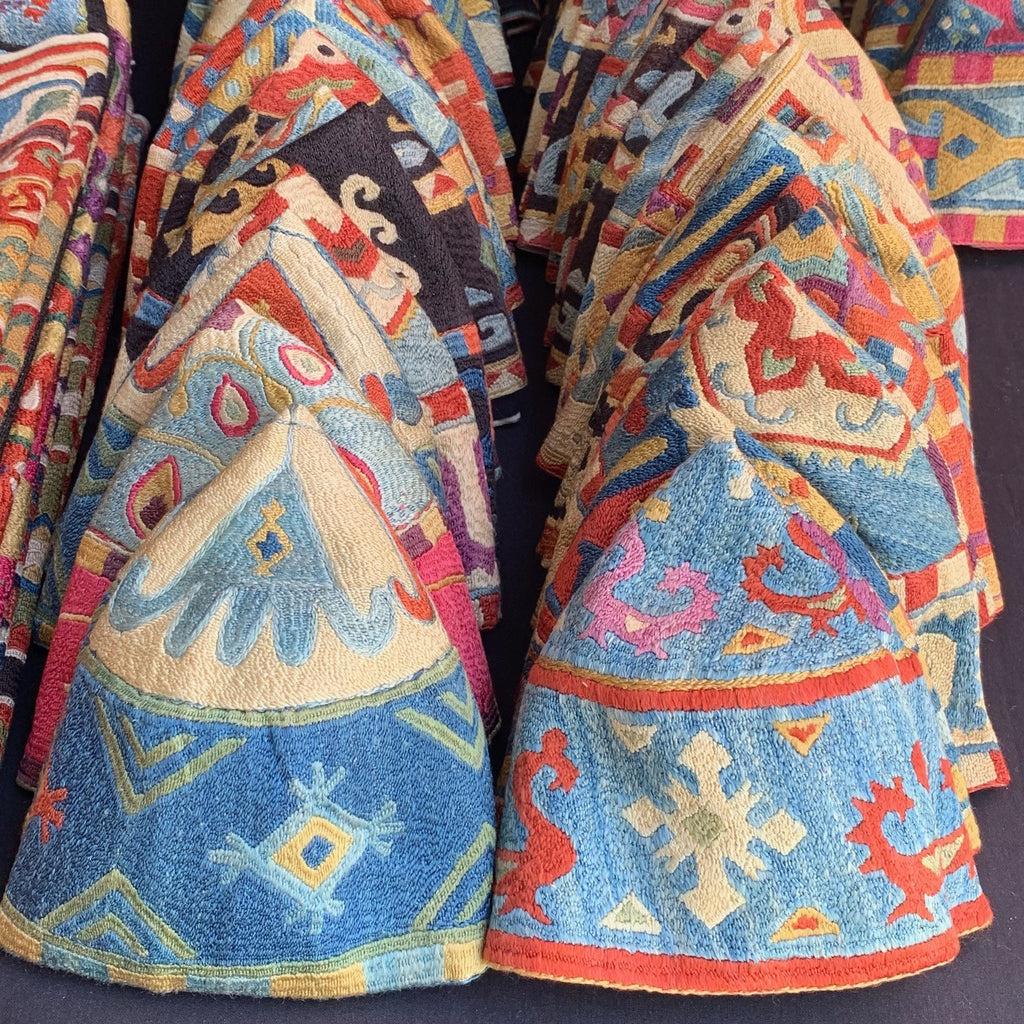 Using only silk, hand spun and hand dyed, and the 16th century surface darning technique, Mehmet Cetinkaya creates majestic tapestries inspired by the historical textiles of Central Asia, Anatolia, and the Caucasus. Through extensive research and with his own artistic interpretation, he fashions these into the finest kaftans, coats, hats and decorative objects.