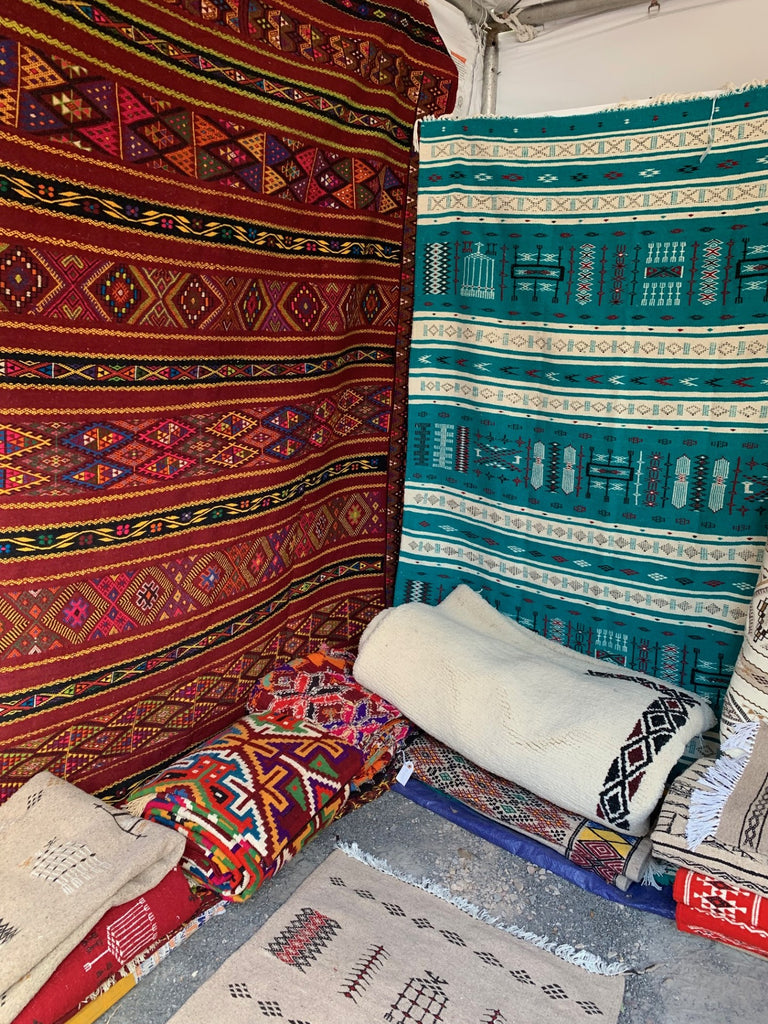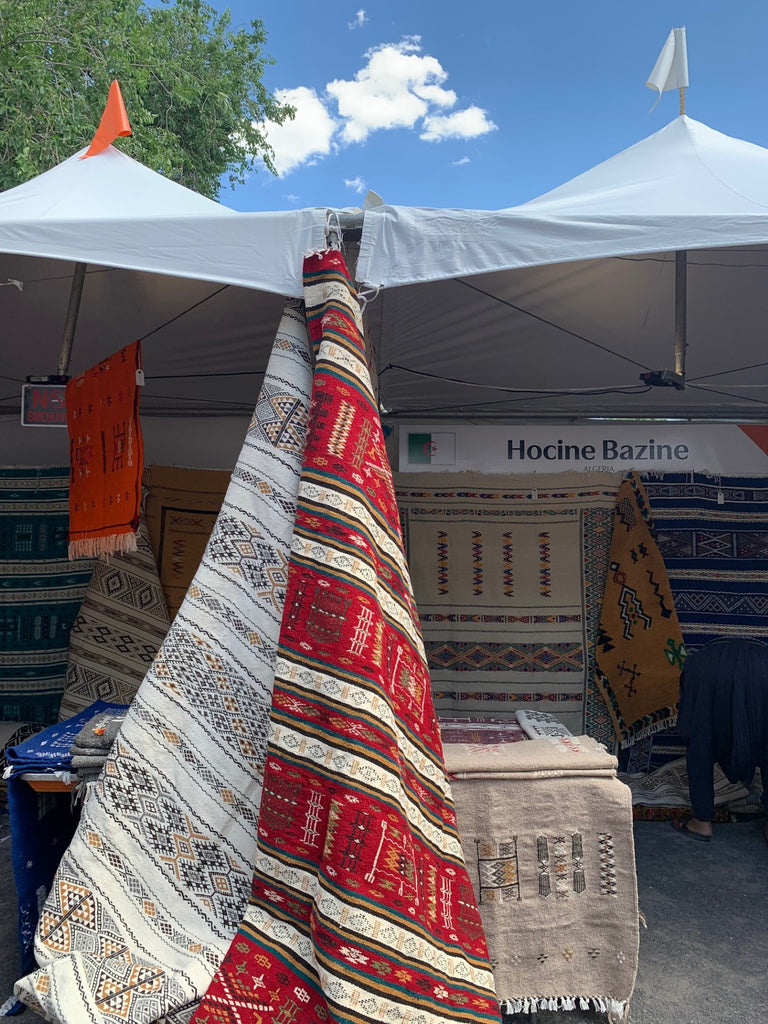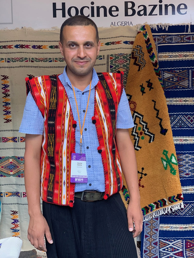 Wandering into the carpeted tent of Hocine Bazine is to discover a desert oasis of bold geometric patterns traditional to the Mozabite, a subgroup of the Amazigh people who for centuries have been known for their distinctive textiles, in Northern Algeria. Master weaver Bazine learned the craft from his grandmother. Lushly crafted from the finest sheep’s wool on vertical looms, the allure of these natural dyed and natural undyed carpets from Ghardaia seduce with their singluar visual language.
