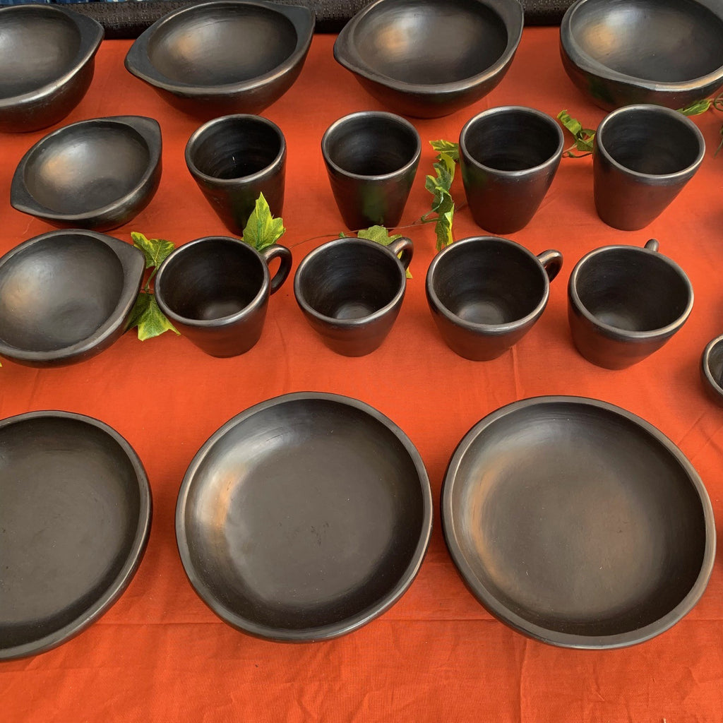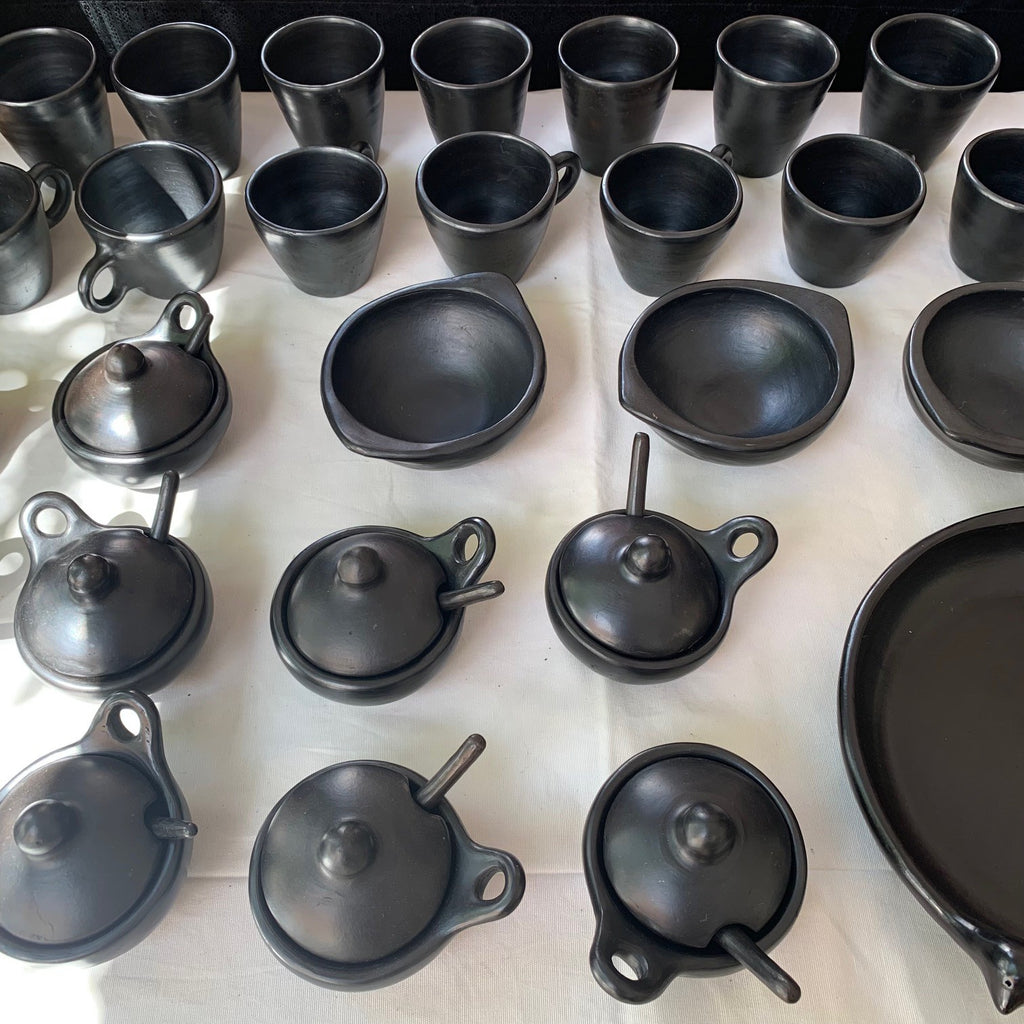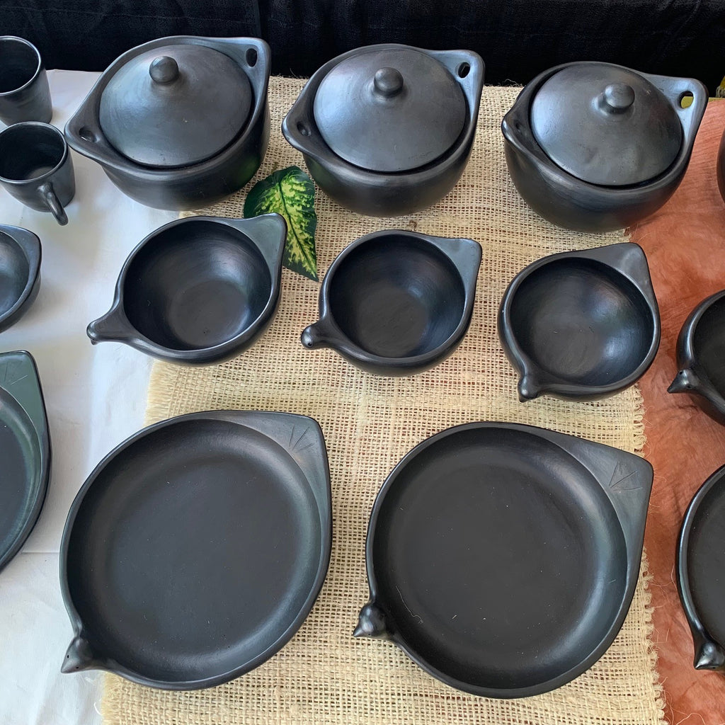 Resonating with a stark elegance, the pottery of Chipuelo Oriente has been crafted for everyday use. Simple crockery forms are rendered into objects of desire by their soulful lustrous patina, the result of a unique burnishing process with agate stones. In the Tolima department of Colombia, 130 artisans are devoted to this craft which has been passed down through generations for over 300 years. Unique river clay is mixed with sand and handbuilt using a pinch pot and hand molding method— no tools! High fired in wood burning ovens, the burnished pieces are then smoked with dung cakes, branches and leaves to achieve the stunning black finish.