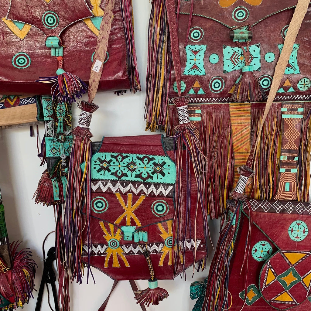 The Tuareg cross is nonreligious and represents “love.” Culturally, men do metal work and women work with leather. Having learned leatherwork from her mother, Moussa’s sister Haoua has become a master of her craft, creating tassels, pouches and bags in the historic tradition of Tuareg camel bags. Leather tanned with natural plant dyes is worked with appliqué, conveying sacred geometry, constellations, and symbols of the four directions. It's channeling Talitha Getty in the 1970s.