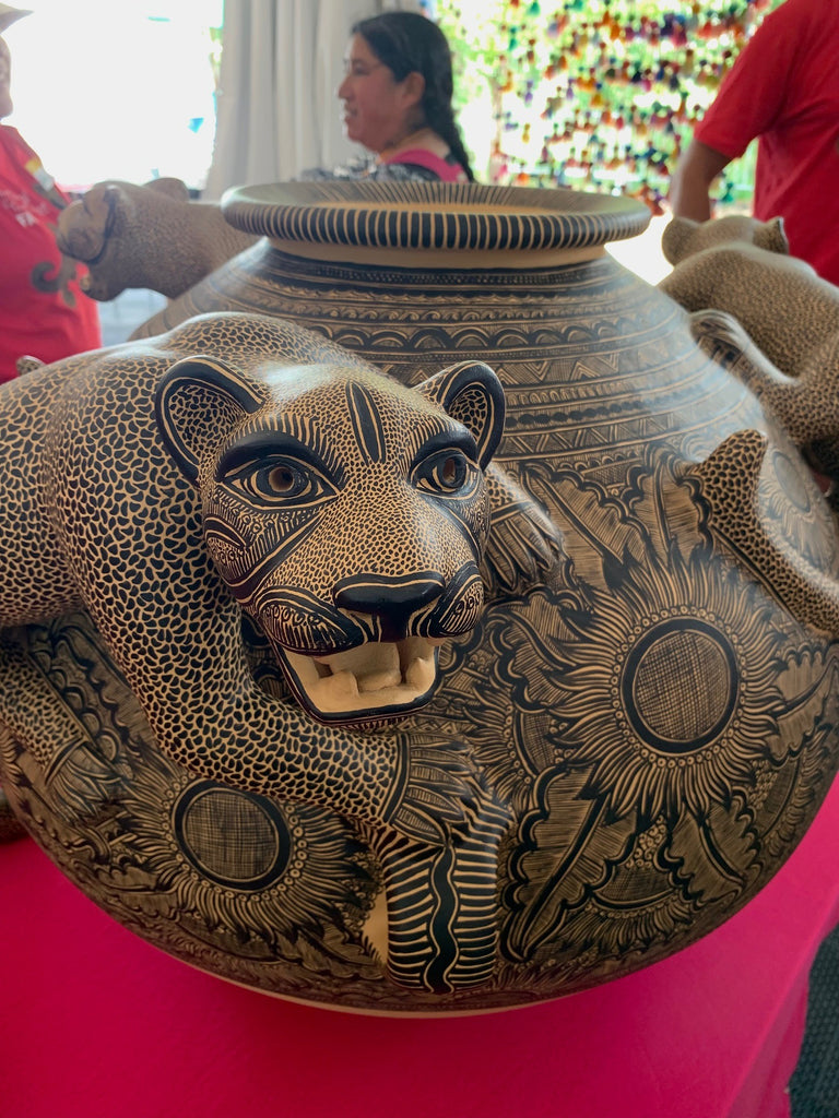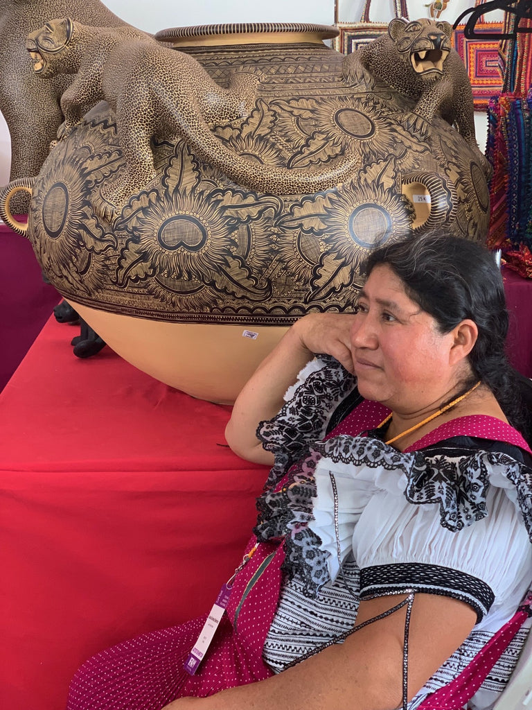 Strolling from booth to booth, one is suddenly confronted by the astonishing ceramic jaguars created by the artist Juana Gomez Ramirez - unique in their scale and power, and in the refinement of their craftsmanship. Jaguars are sacred animals to the Tzeltal and other ancient indigenous cultures and have been worshiped among the Mayan peoples since millennia. Juana learned clay making at the age of eight from her mother in Amatenango del Valle, an historic pottery making village in Chiapas.