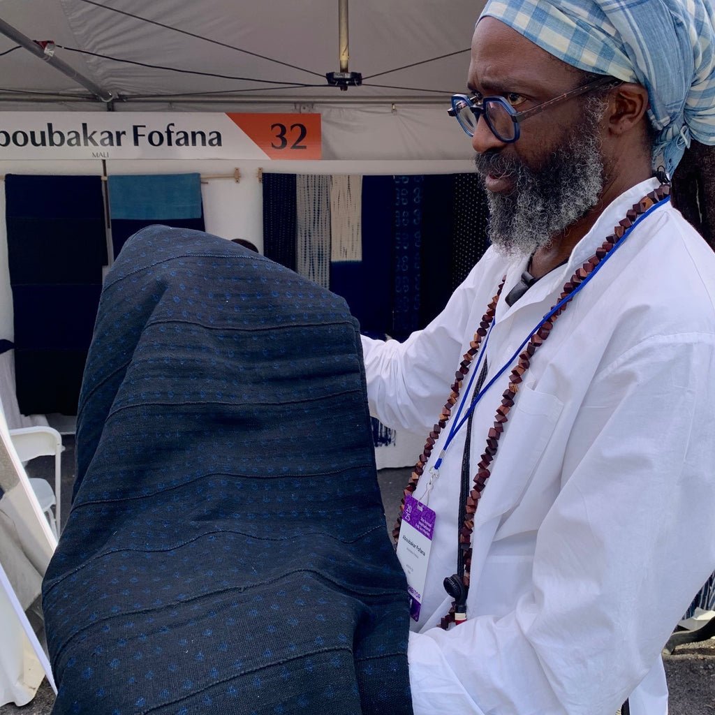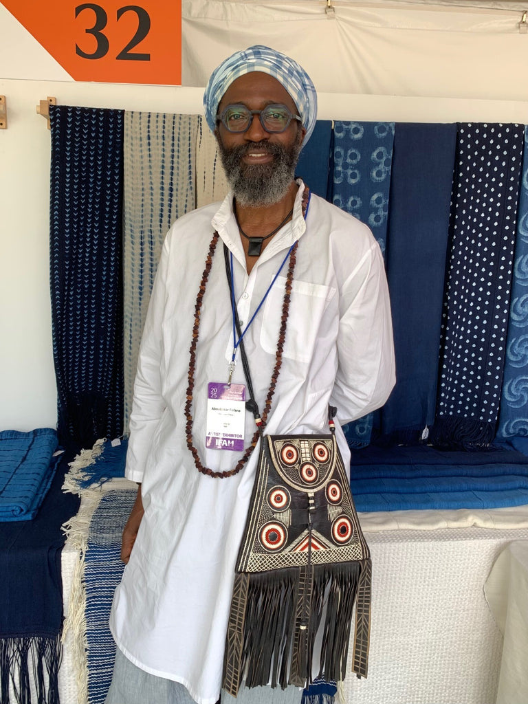 One falls under the spell of seduction upon entering the tented booth of the great indigo master dyer, Aboubakar Fofana. In West Africa, indigo textiles denote respect and status in those who where them, and the statuesque Fofana suggests “each shade is a different emotion.” Reviving the ancient tradition of indigo dying in Mali, Fofana farms his crops of Indigofera arrecta and Philenoptera cyanescens and hand dyes his spun cotton, hand woven into the most sophisticated textiles and crafted into the most refined tradtional clothes and home goods— all highly desirable. “My products have two sides: traditional and modern. Tradition is one thing, but as an artist I have to give a contemporary language to that and give people a product they can recognize themselves.”