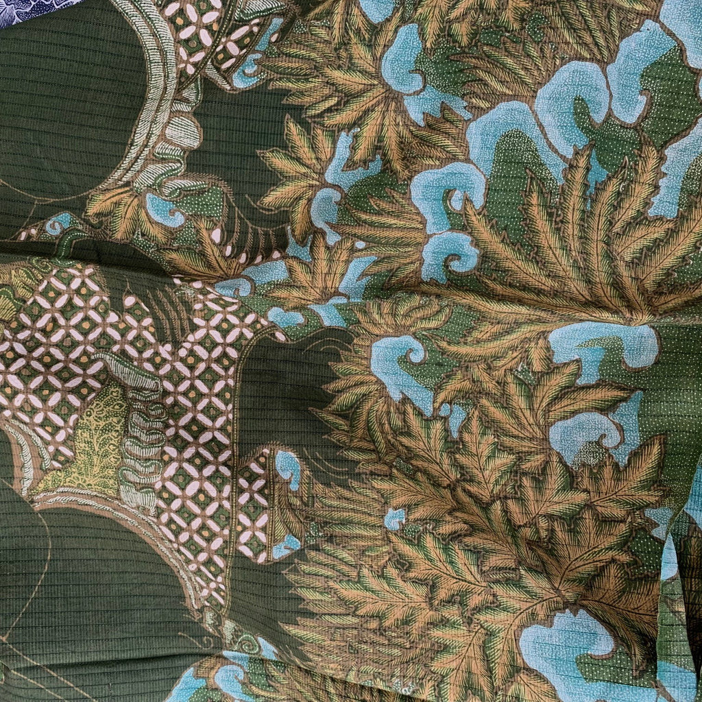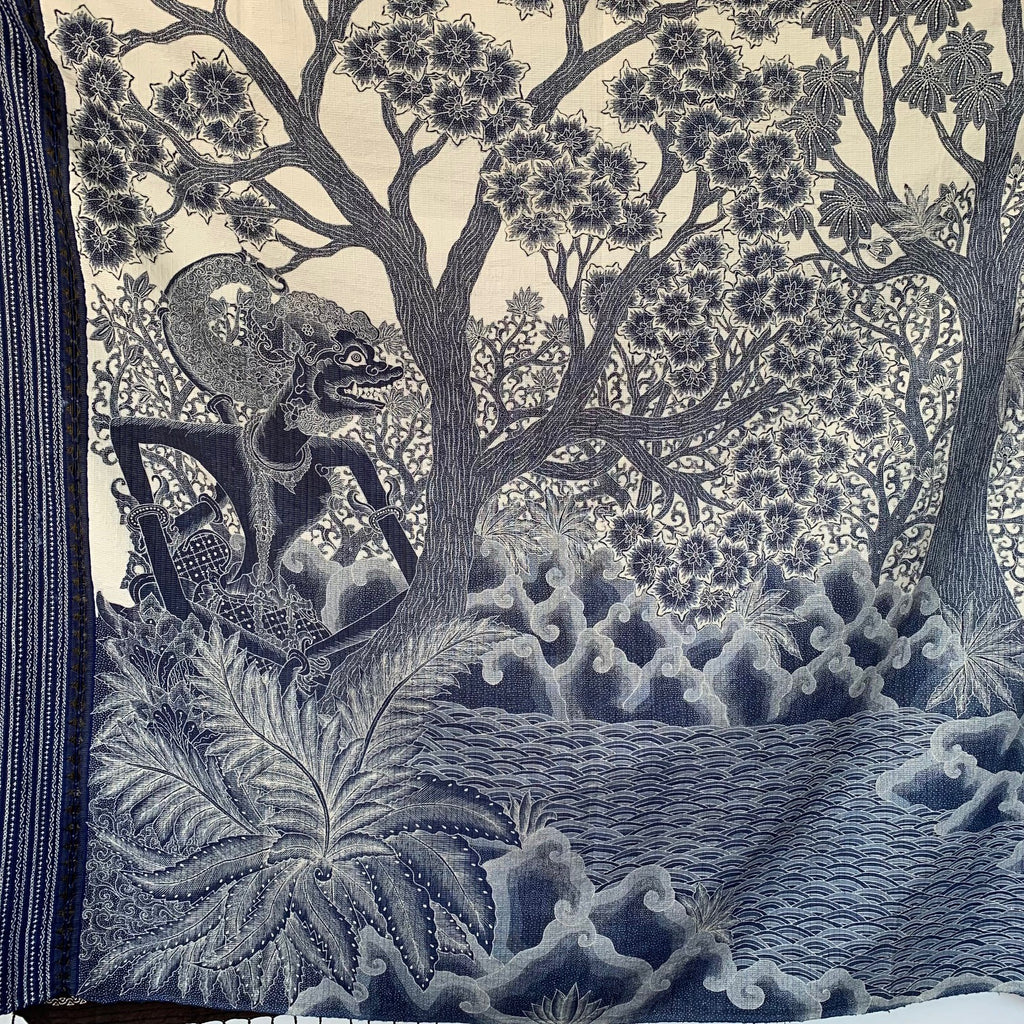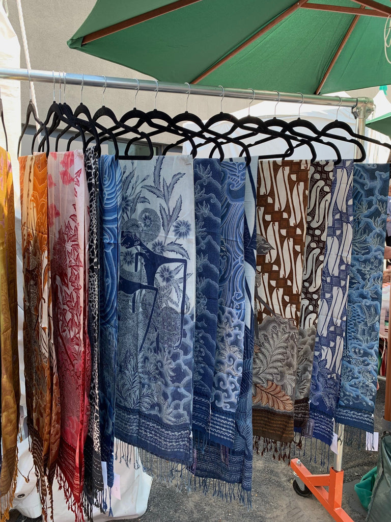 New to the Market this year was the mesmerizing beauty of the batiks of Dudung Alie Syahbana, great works of enormous refinement. Because they embrace both tradition and innovation, one enters into a fantasy world of imagery based on wayang stories of Javanese romantic tales and religious legends, hand drawn and stamped wax resist designs on silk, hand dyed with indigo and luscious vegetable greens.