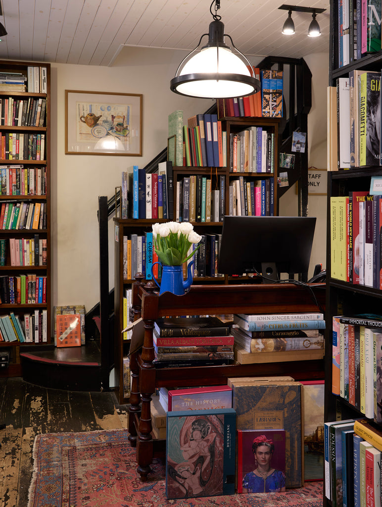 John Sandoe Books is made up of three very small 18th-century buildings. Though from the outside—or even inside—you’d hardly guess they’re separate. And the way things are organized is not obvious to new customers, as it’s very much shaped by the quirks of the architecture. You can definitely get a bit lost in there. We, of course, know where everything is, but the unusual layout leads to some unexpected juxtapositions—like finding Isherwood’s letters next to a book on art.