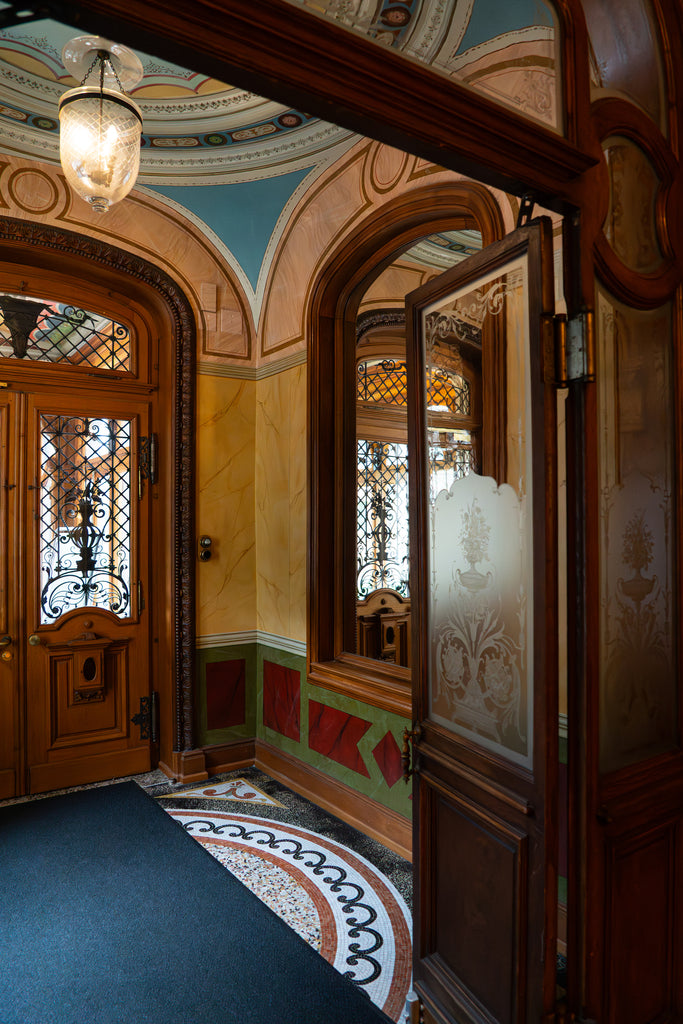 The chef d'oeuvre, however, is the villa’s 'Asian-themed' dome gallery on the upper floor. Carved from wood and adorned with vibrant colors and Chinese script, the space transports visitors to a distinctly non-European world - a world where exotic birds and plants wind their way across the gallery, while colored light filters through stained glass. Grob's continued relations with Chinese traders in Sumatra after his return are evident here in a space said to have been inspired by their homes.