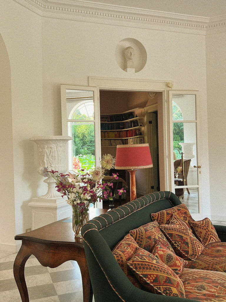Though built in the 1980s, the estate feels timeless. Once owned by a botanist and philosopher, whose presence lingers in the lush layers and thoughtful design. In 2019, Milanese creatives Gemma Richards and Niccoló Rignano restored the property, blending antiques, rich fabrics, and a library that speaks to both intellect and instinct.