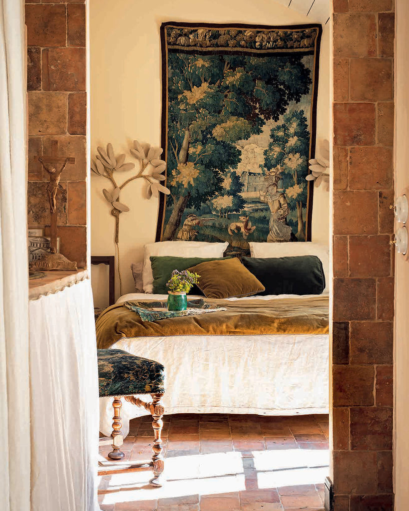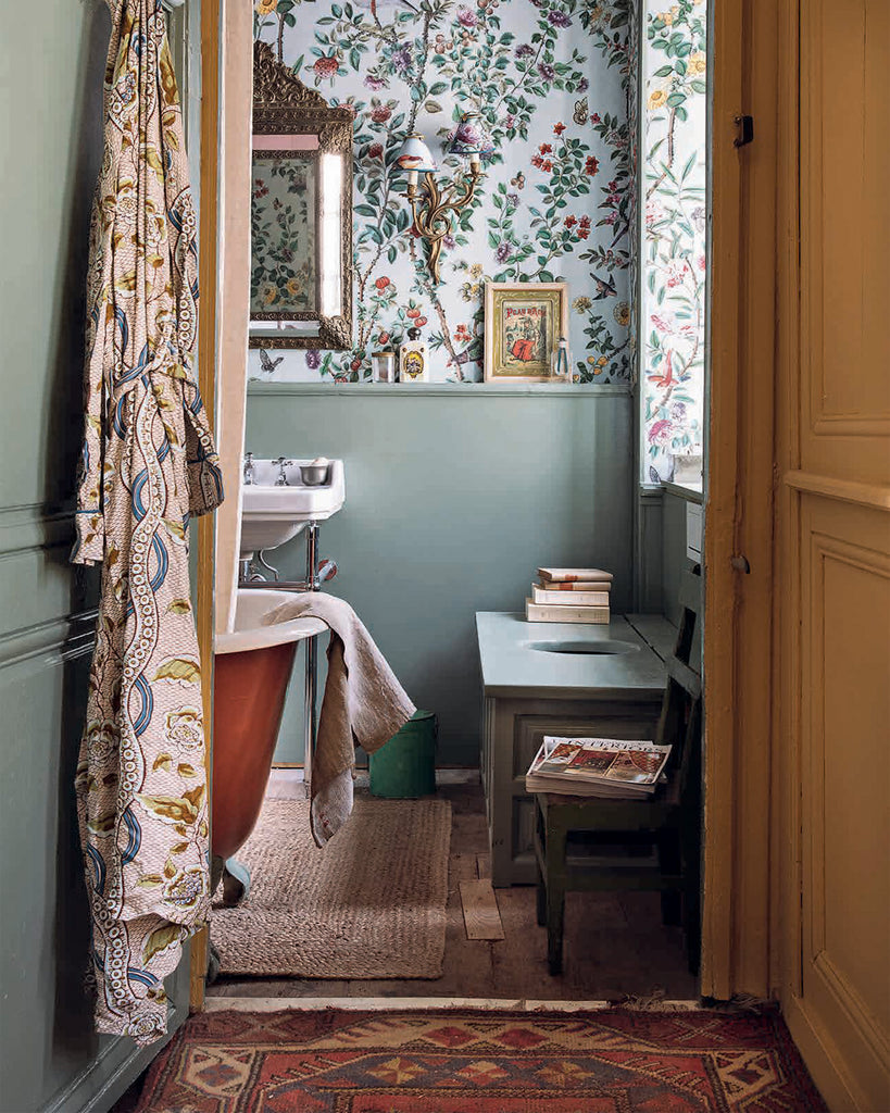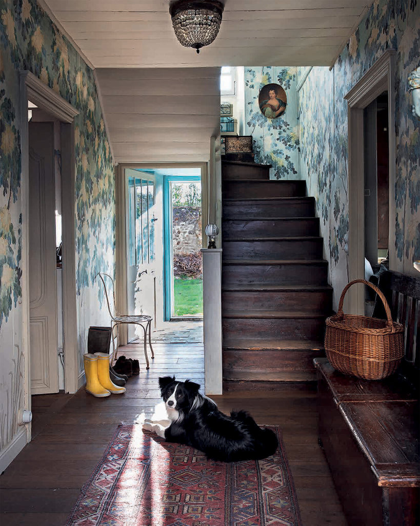Maison Lescop—the historic residence of an eighteenth-century French importer for the Indian trading company in Port-Louis, Brittany—seemed predestined to become the new home and restoration project for the creative duo behind Antoinette Poisson, a Parisian design team dedicated to reviving the savoir faire of domino paper for home decoration and furnishings. The art historians became enchanted by the poetic beauty of this artisanal craft—derived from an Indian block print technique—when they uncovered original hand-painted eighteenth-century domino wallpaper while restoring a mansion in central France.