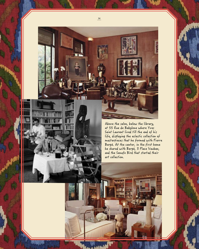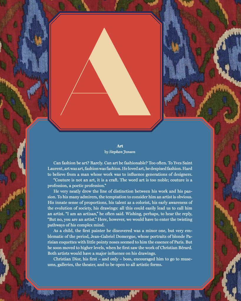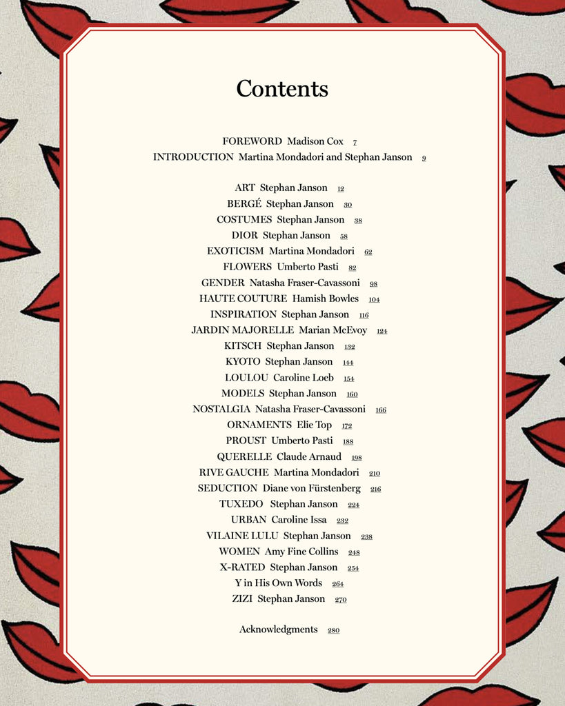 In addition to the kaleidoscope of images in this book, a coterie of tastemakers have supplied listings that encompass YSL’s style inspirations (C is for Costumes, as exemplified by the Russian theme of the famed autumn-winter 1976–77 collection; T is for Tuxedo, which the designer initially referenced with his 1965 “Le Smoking”) and important facets of his life (J is for Jardin Majorelle, the garden of the couturier’s paradisiacal retreat in Marrakech; R is for Rive Gauche, the bohemian, chic neighborhood of Paris where the YSL boutique is situated and also the name of the house’s famous perfume launched in 1970). This distillation and celebration of the designer’s life reveals the inner world of a twentieth-century master.