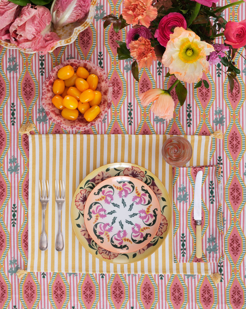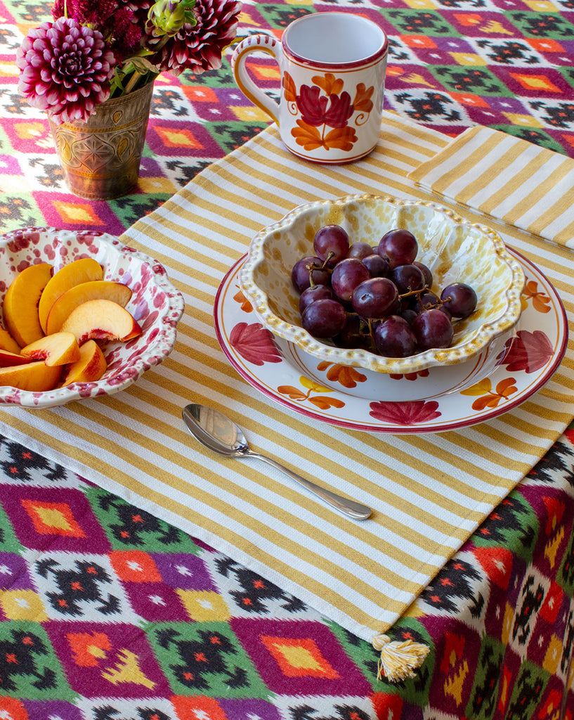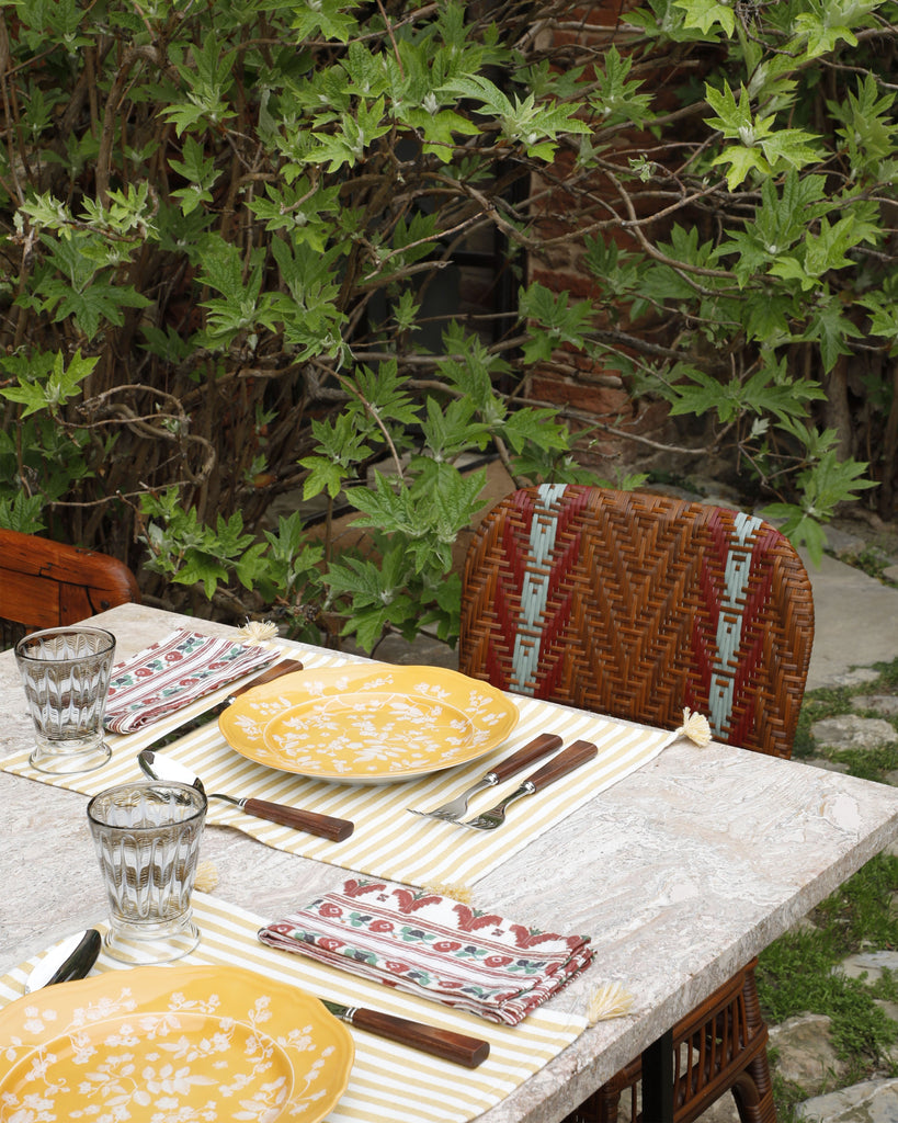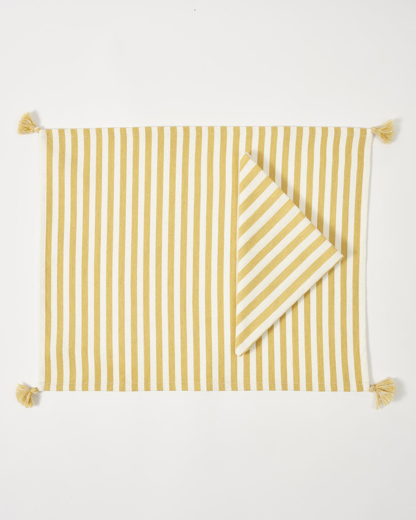 These delightful Guri I Zi yellow striped placemats are handmade in a village in the Albanian mountains. Keeping the textile tradition alive, artisans use a loom made entirely of wood, following the techniques passed down from generation to generation for over a century.