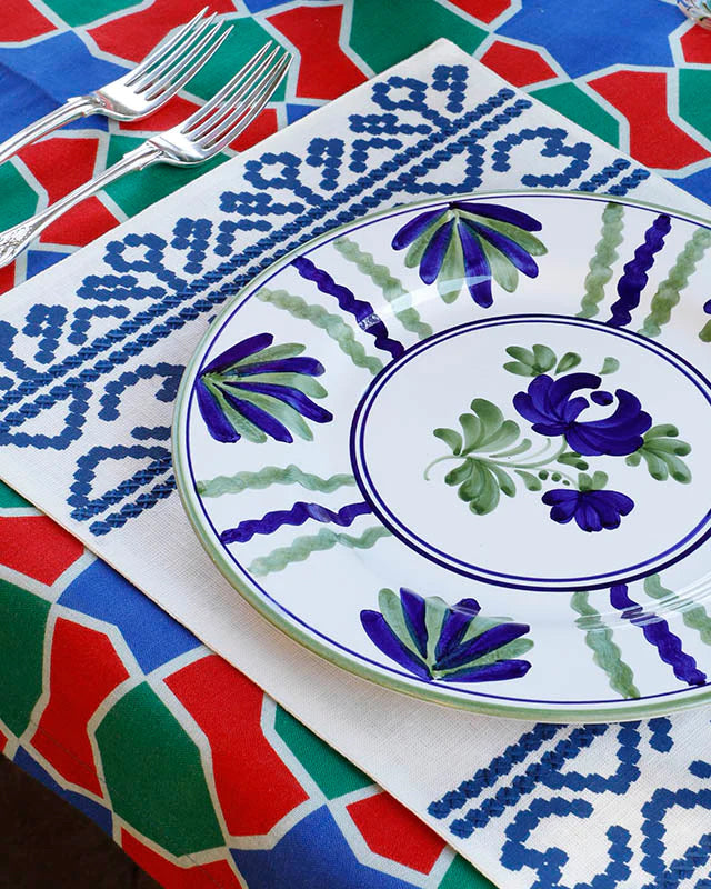 The Goya placemats are hand-embroidered and hand-painted by the small team of local women at Malaika Linen’s workshop on the outskirts of Cairo. Their striking motifs, rendered in deep blue, pay homage to local decorative traditions while also embodying a modern boldness.