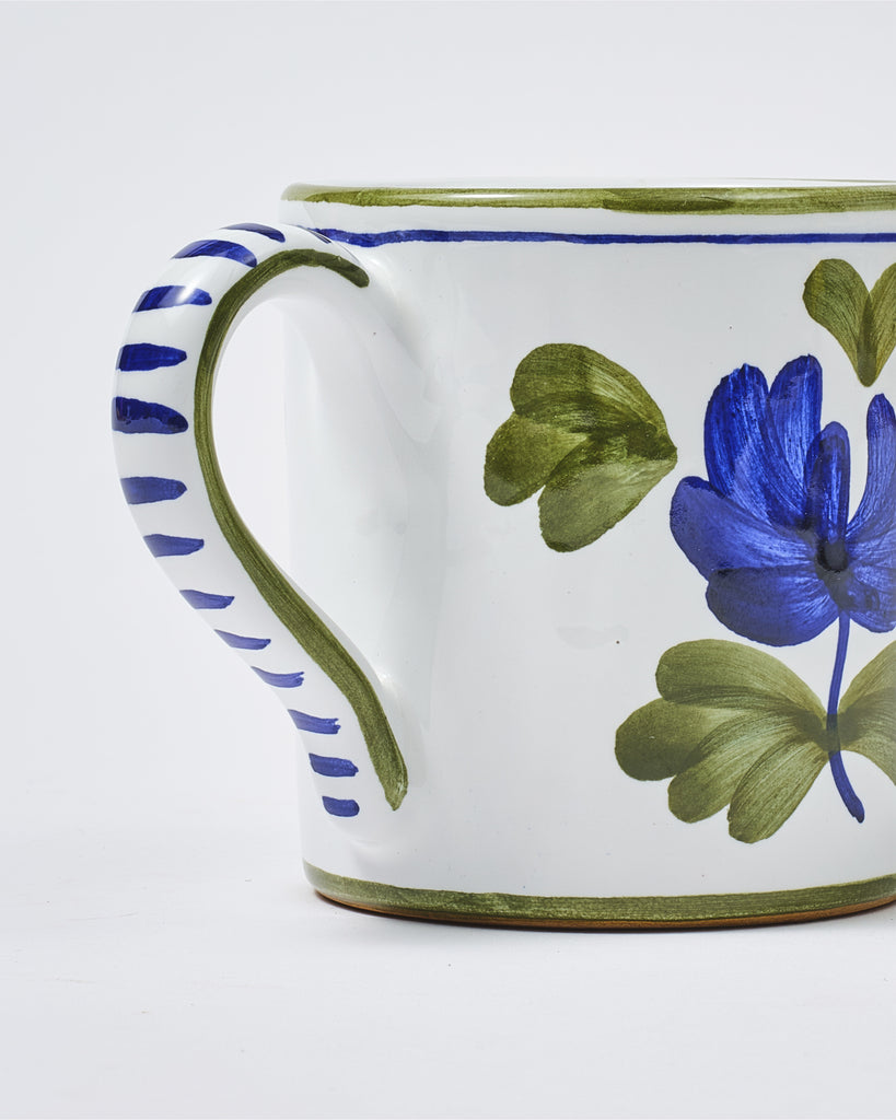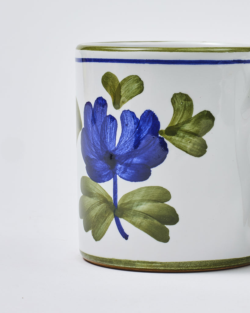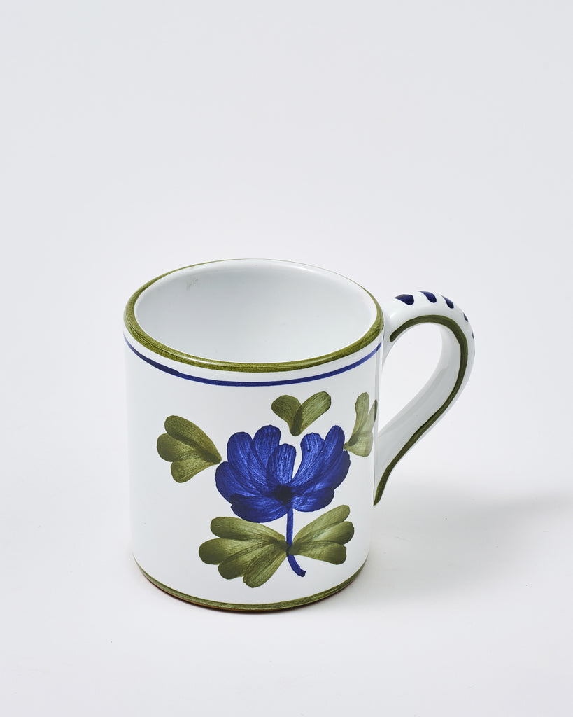 The Blossom Mug is handcrafted and hand painted by artisans in Umbria. Featuring a blue and green floral pattern, it will add charm to your morning coffee or tea routine. Available as a single piece, the mug can be matched with the same style, or coordinating color in burgundy and yellow. Complete your Blossom collection with matching sets of mugs, espresso cups, pitchers, dinnerware and more.
