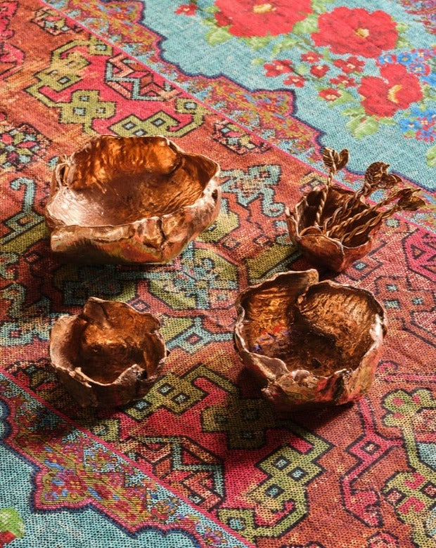 Italian designer and maker, Osanna Visconti, casts exquisitely detailed jewellery and objects, both functional and decorative, from natural bronze using the lost wax technique - an ancient method that Greek and Roman artisans have been using since bronze was discovered 3000 years ago. The Carryall Bronze bowl is a timeless piece inspired by nature and will surely be a lasting treasure. Discover Osanna's collection of bronze works including candlesticks, bowls, serving spoons, tea spoons and more.