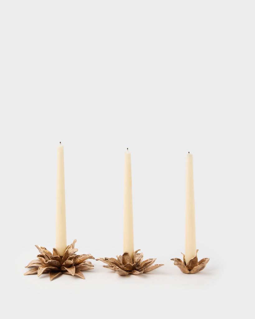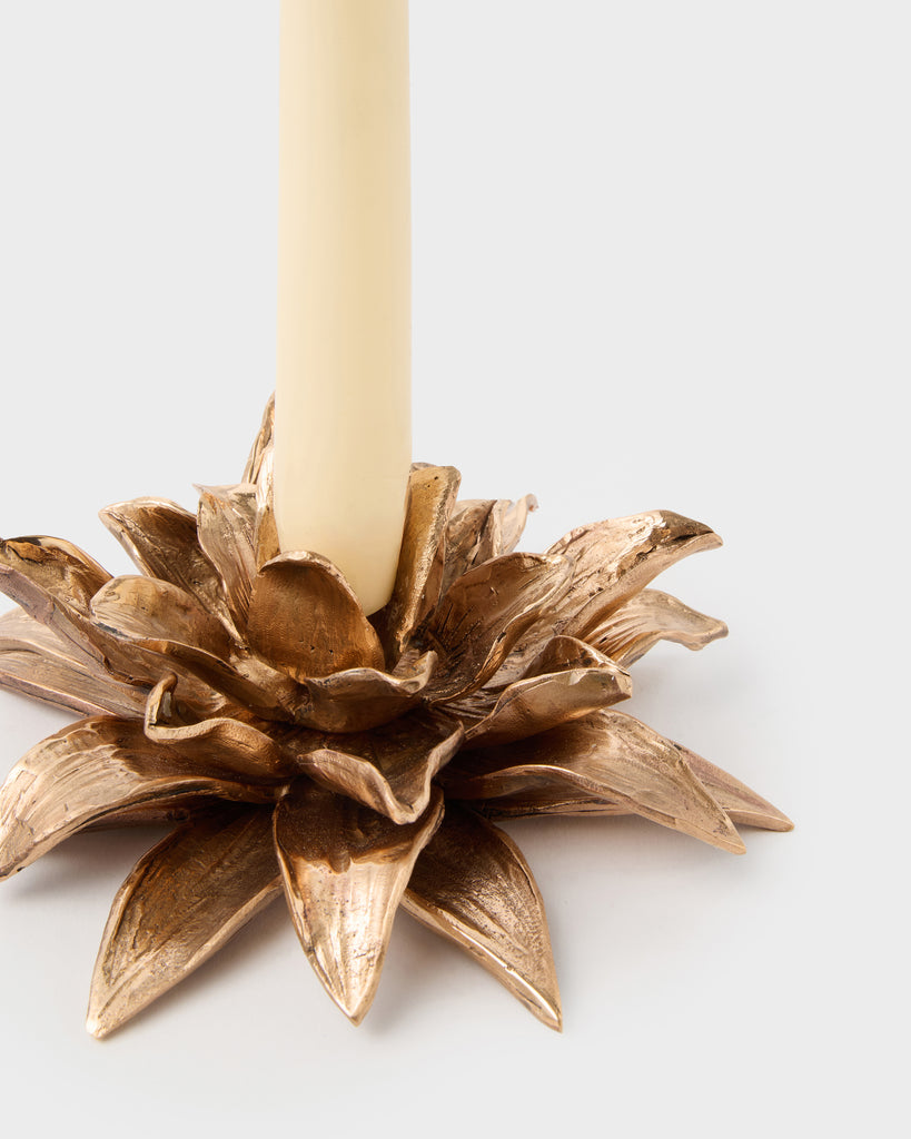Italian designer and maker, Osanna Visconti, casts exquisitely detailed jewellery and objects, both functional and decorative, from natural bronze using the lost wax technique - an ancient method that Greek and Roman artisans have been using since bronze was discovered 3000 years ago. The Dalia Bronze Candle Holder is a timeless piece inspired by nature and will surely be a lasting treasure. Discover Osanna's collection of bronze works including candlesticks, bowls, serving spoons, tea spoons and more. Please note that candles are not included.