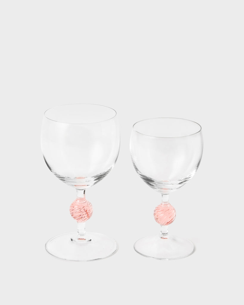 The Demetra Glassware represents Cabana’s first complete collection of stemware, comprised of wine glasses, water glasses, champagne flutes and a beautiful hand-painted jug. With a central pink "marble" in its stem, it is elegant yet playful - perfect for all occasions.