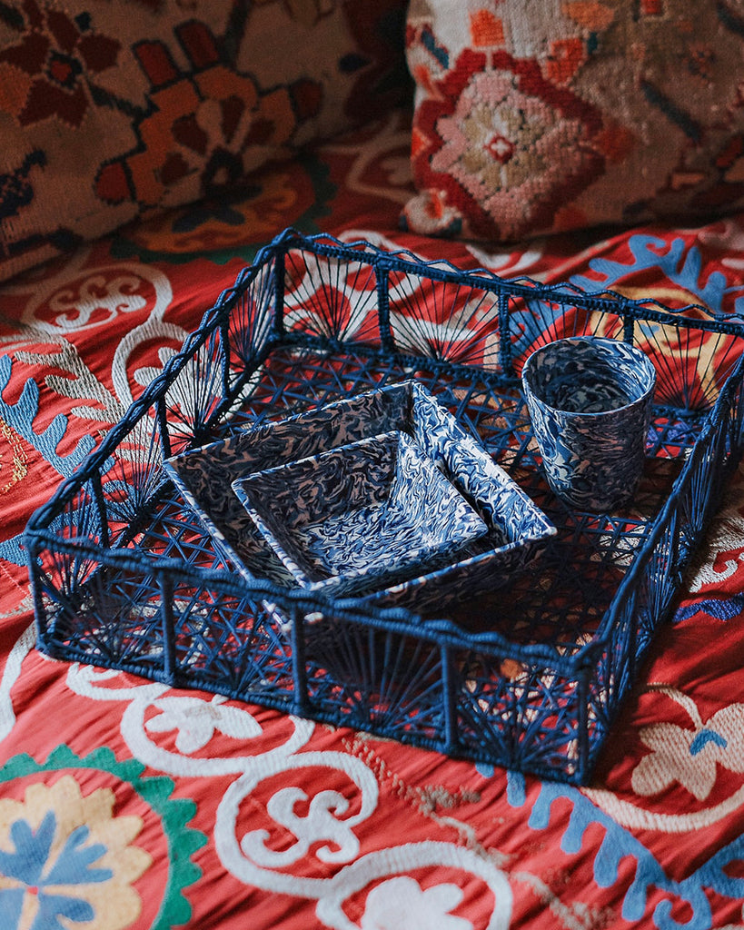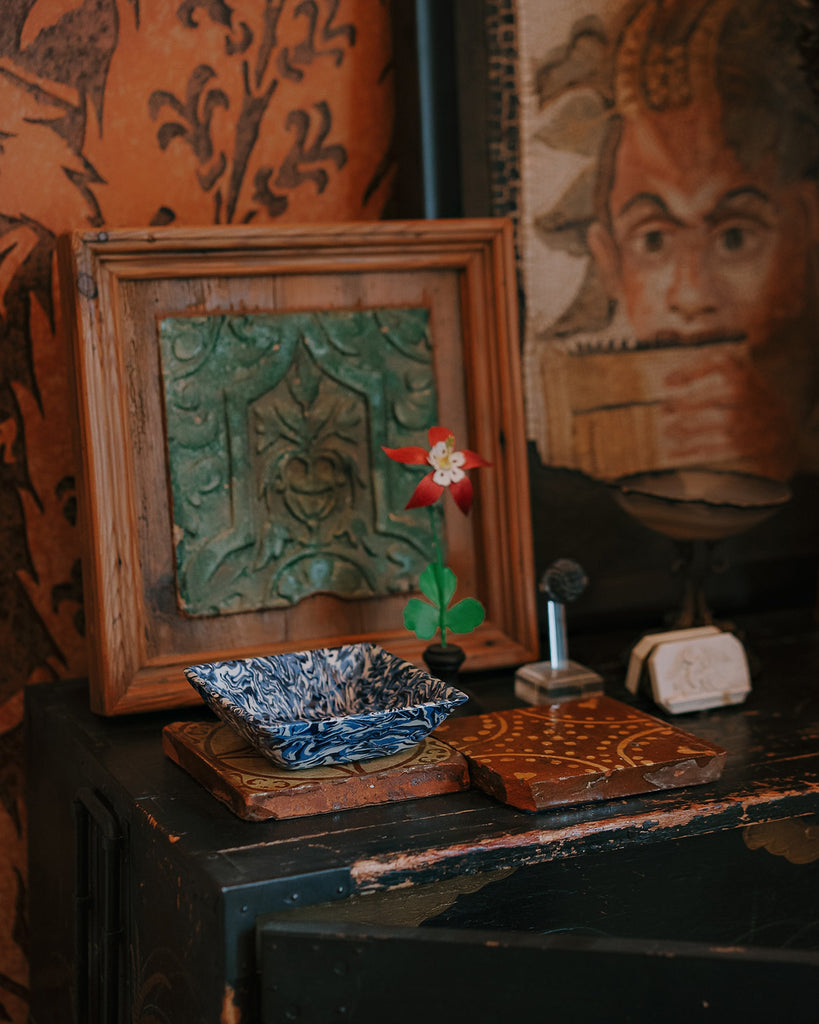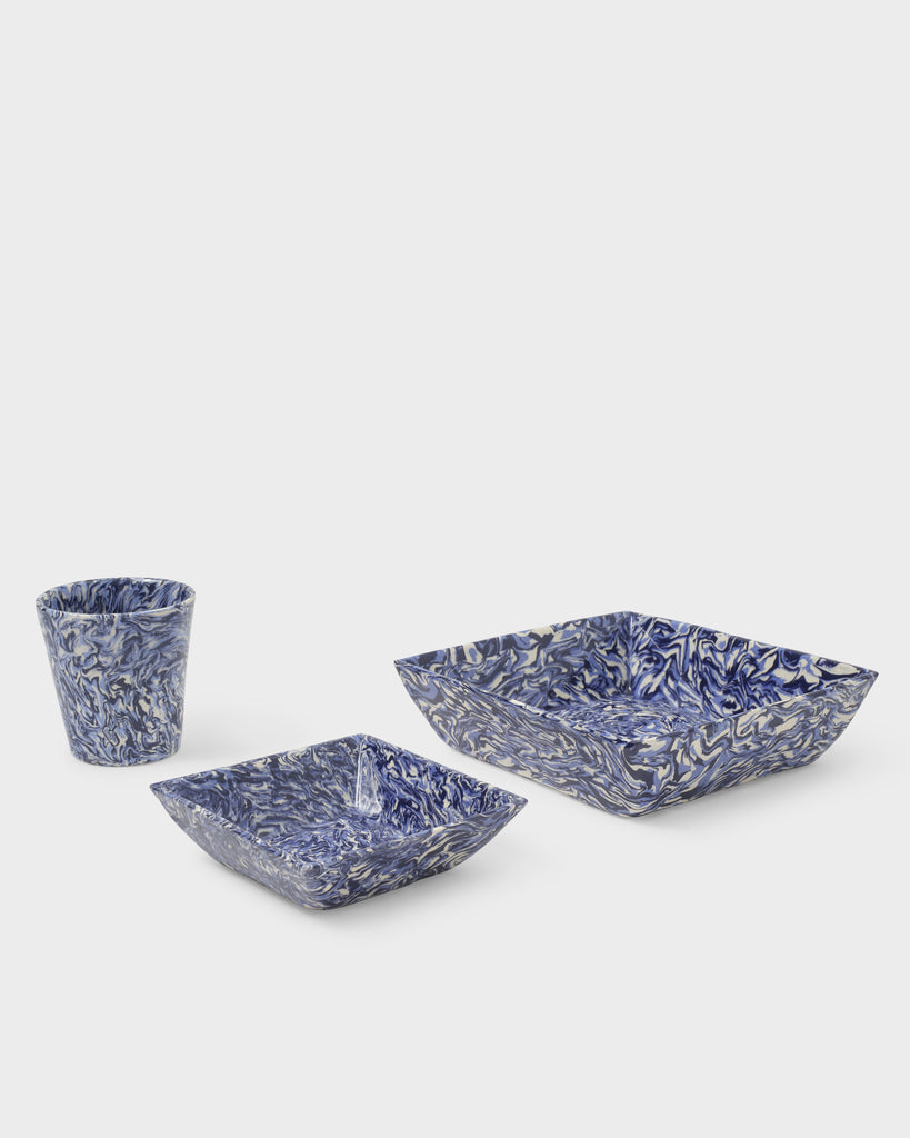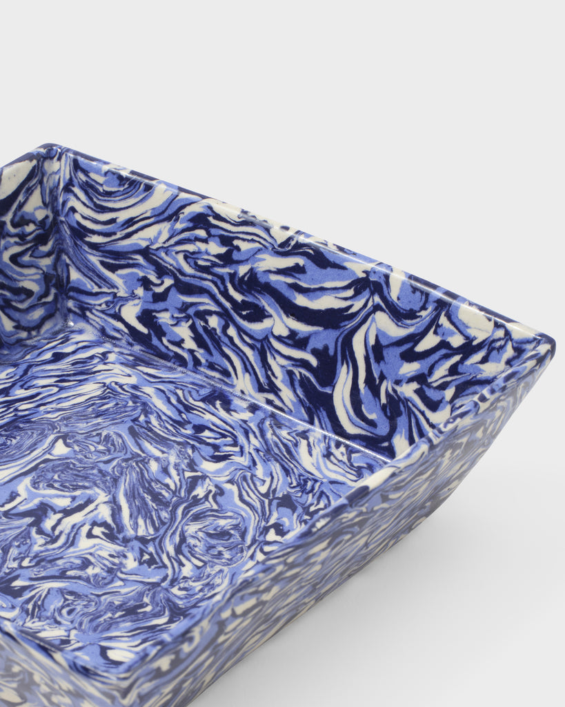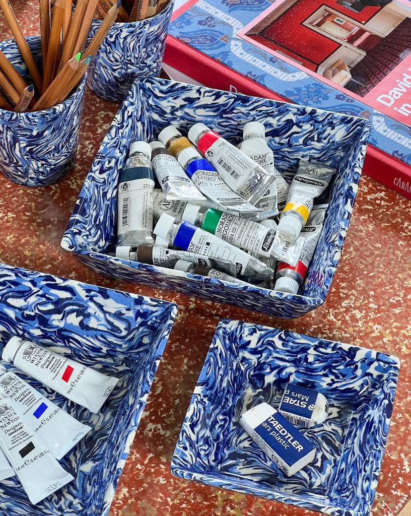 This Marbled Mini Vide Poche, handcrafted in the workshop of Pascal Mestre, pays homage to decorator David Hicks' bold use of color and pattern. The blue and white marbling, created using techniques to evoke the colors of Apt, France, adds a unique touch to any collection. Pair it with other pieces from the range to fully embrace Hicks' eccentric design aesthetic.