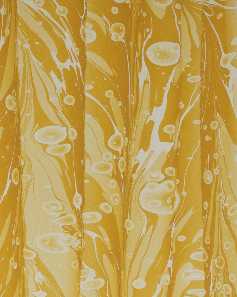 Marbling is an ancient technique from the Orient, which is known in history for its mastery of abstract decoration. The marbled pattern is created by combining pigments, oils and water in different quantities in a vat, which are then mixed carefully by the craftsman to create unique designs that can never be exactly recreated. Available in four colors: green, yellow, light blue and orange.