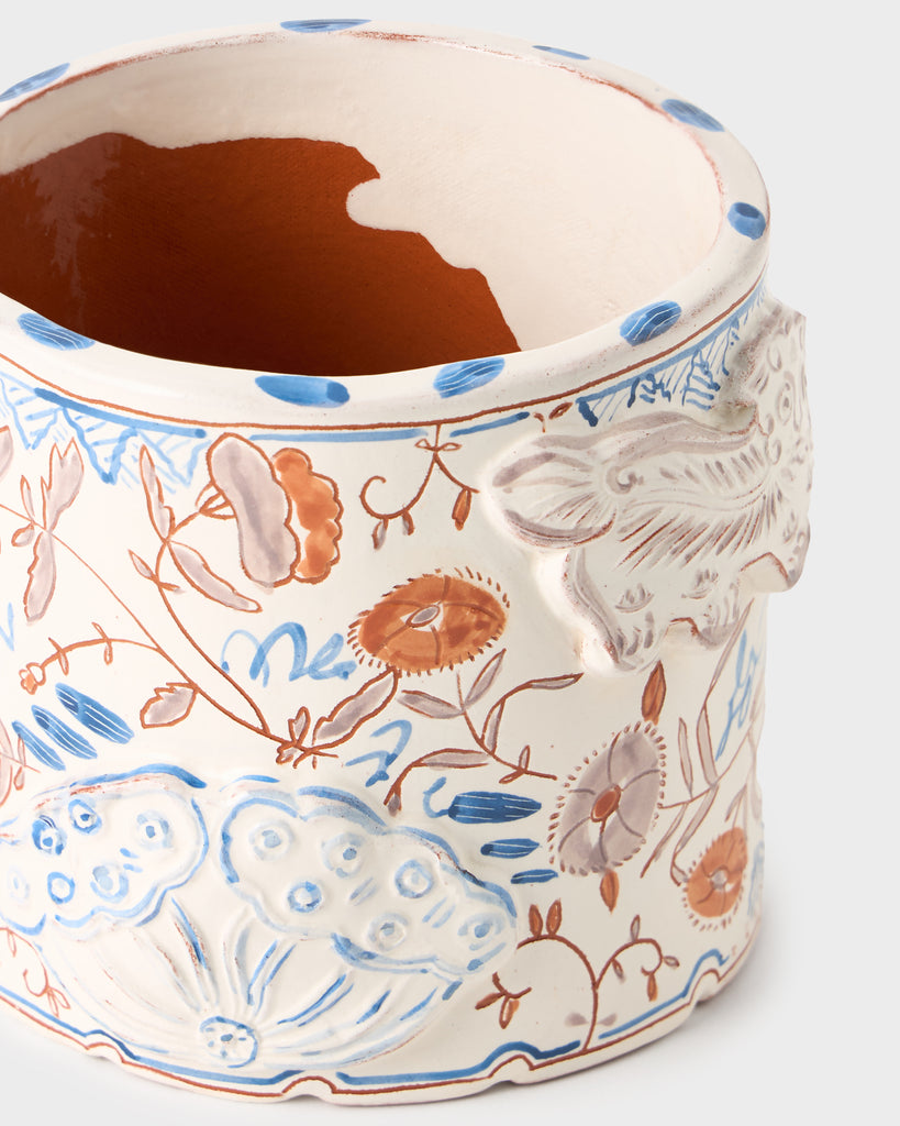 When Sophie Wilson’s three youngest children were small, she decided to open a little shop in the entry hall of her gorgeously dilapidated 16th-century manor house in the English countryside. She sold some soap and jam and candles, but when the potter she enlisted to make ceramics couldn’t keep up with demand, she decided to make them herself. Thanks to her very personal aesthetic and the intimate photography she did of her work amidst her actual family life in the faded glamour of her old house and the power of Instagram, the rest is history. The shop closed, and the ceramics took off. Wilson’s work is fantastical and intelligent, mining the history of decorative arts and her own personal passions, and so deeply human and obviously handmade. Her signature technique is slipware—a style associated with the Staffordshire potteries of the 17th century, created by coating semi-hard red clay with a ‘slip’ of liquid white clay. She then uses the centuries-old Roman decorative technique of sgraffito( meaning scratched), where she etches her vigorous, sinuous line drawings into the wet surface to reveal the red clay beneath.