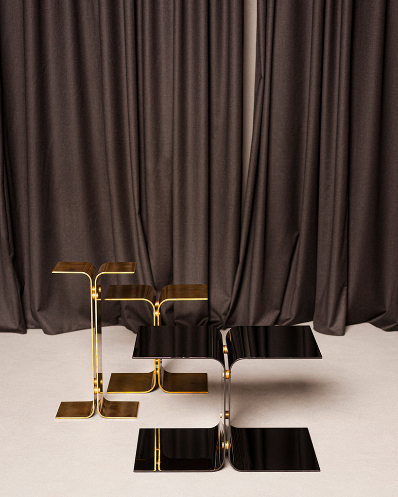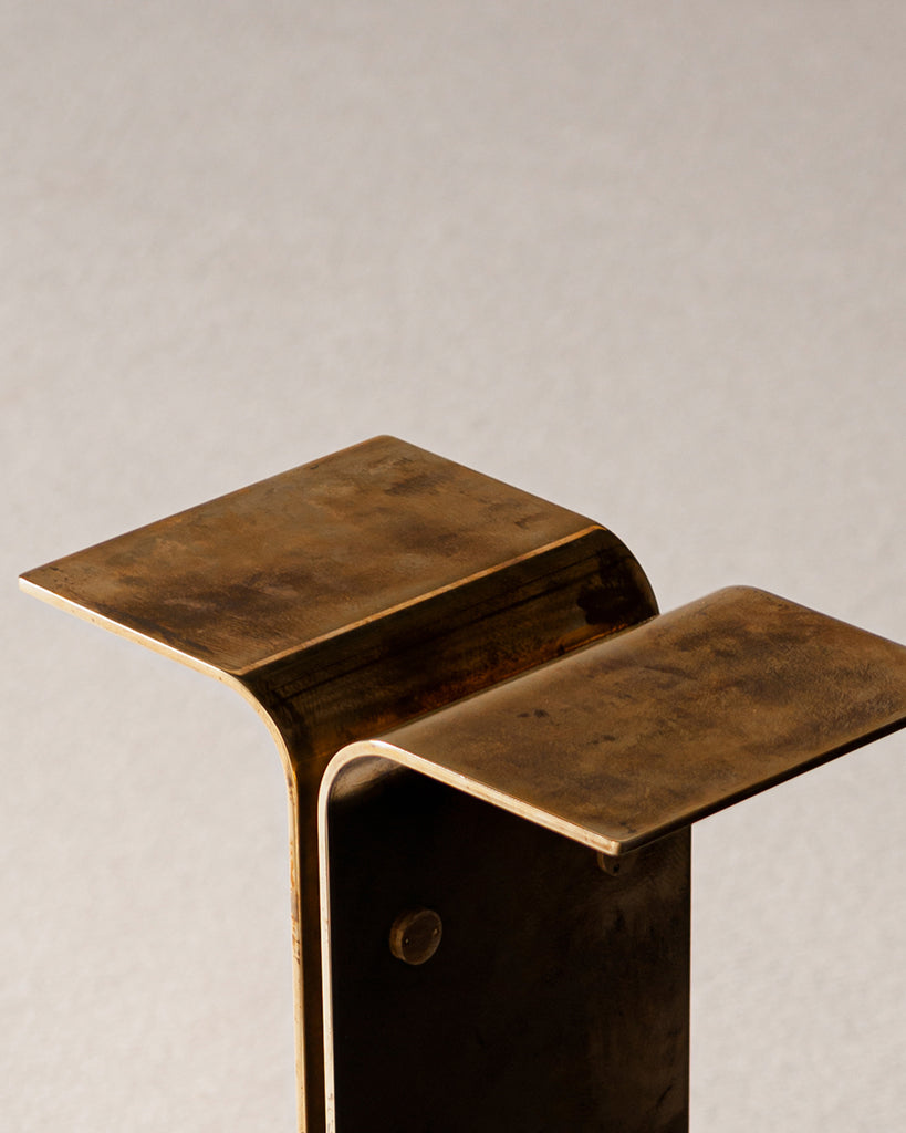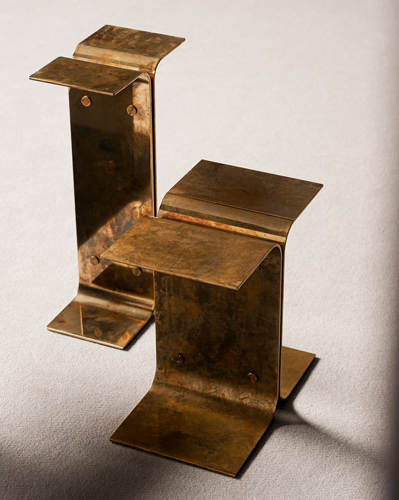 Founded in Milan by Britt Moran and Emiliano Salci, Dimorestudio is a globally renowned architectural and design studio that combines a modern, contemporary style with a classic aesthetic inspired by vintage Italian design. The tall table features two C-shaped elements crafted in either polished oxidized brass or polished brass, with fixing studs in brushed brass. The option to add a cushion for the pouf version adds versatility.