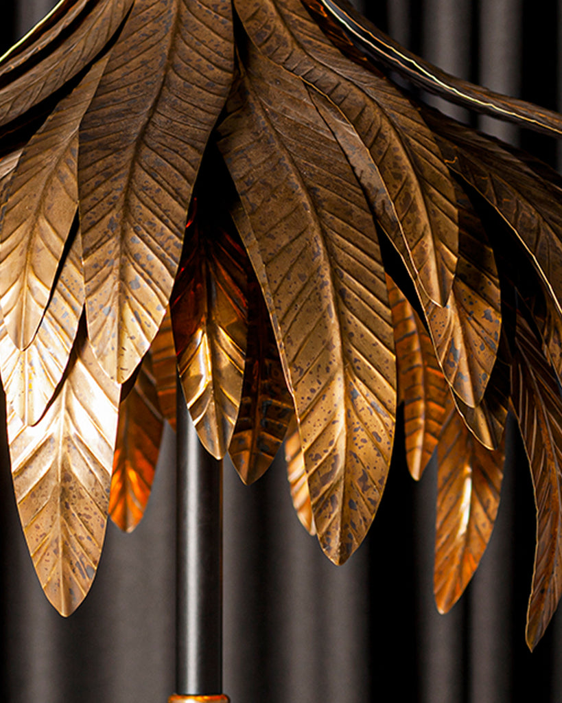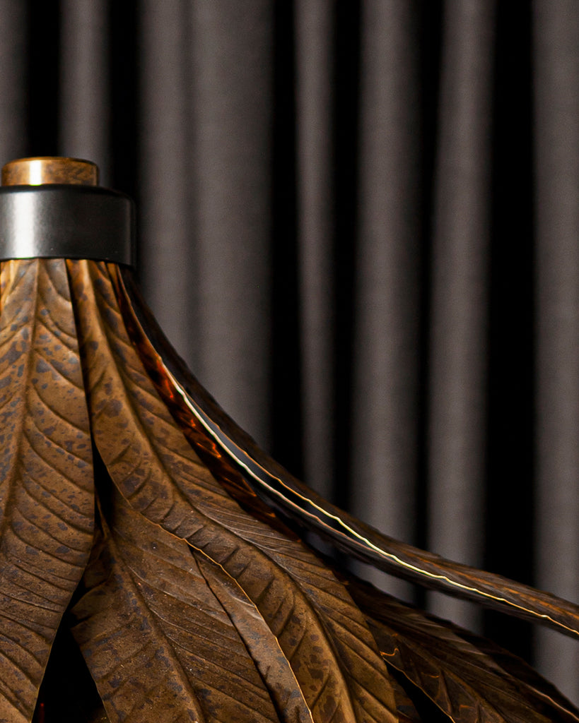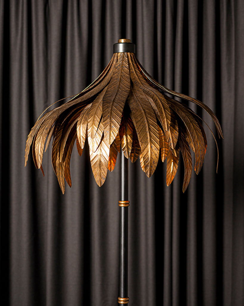 Founded in Milan by Britt Moran and Emiliano Salci, Dimorestudio is a globally renowned architectural and design studio that combines a modern, contemporary style with a classic aesthetic inspired by vintage Italian design. The floor lamp features a handcrafted lampshade made of decorative brass leaves, with a matte black painted metal structure accented by brass details. The marble base adds further refinement.