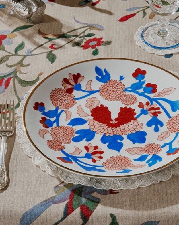 Owing to a mutual passion for interiors and true artisanal craftsmanship, together Rose, The Marchioness of Cholmondeley, and Martina Mondadori have created a tabletop collection inspired by original artefacts at Houghton Hall, North Norfolk. The collection includes table linens inspired by Rose’s 18th century hand painted silk bedroom wall covering, alongside napkins, porcelain plates and silver swans. All objects are carefully made in Italy following months of creative collaboration between the two design conspirators and friends.