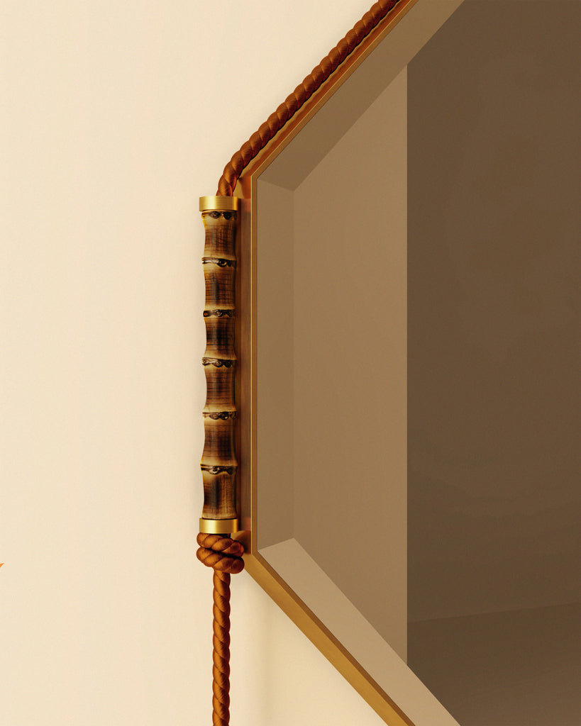Octagonal Wall Mirror by Giuseppe Porcelli is crafted with an octagonal mirror in polished steel with chrome detailing, bamboo root accents, and silk tassels. A sophisticated reinterpretation of decorative tradition, it combines precision craftsmanship with poetic restraint.