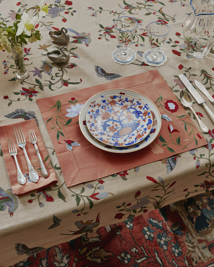 An exquisite example of patterned chintz, the Houghton Hall Magnolia tablecloth is inspired by an 18th-century silk tapestry that drapes over Lady Cholmondeley's four-poster bed. Handmade in Italy from pure linen, this elegantly patterned tablecloth is adorned with fluttering butterflies, Kanga bird motifs and a colorful array of flora and fauna. Pair with our Houghton Hall Magnolia napkins to create a refined table setting reminiscent of this grand English stately home.