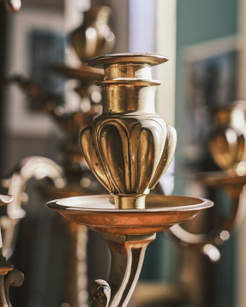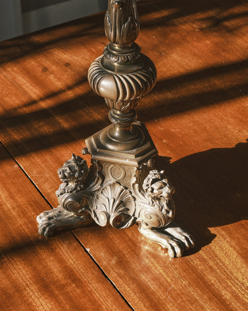 This pair of exquisite Louis XIII style candelabra are crafted in fine patinated bronze. They are very large and have an incredibly opulent effect, with a faded bronze patina and beautifully extravagant detailing. The bases of the candelabra are decorated with rare finely modelled lions, and the central column is carved with acanthus. Each candelabra has three arms with one central candle, totalling five candleholders. They likely date from the 1880s.