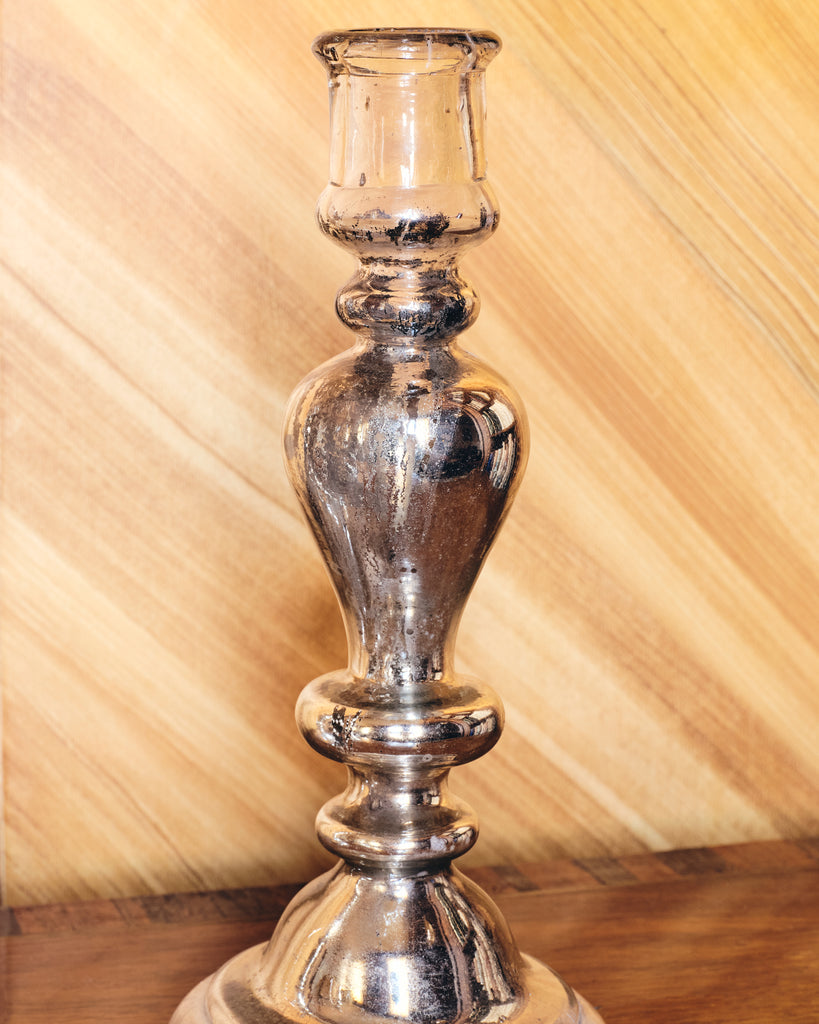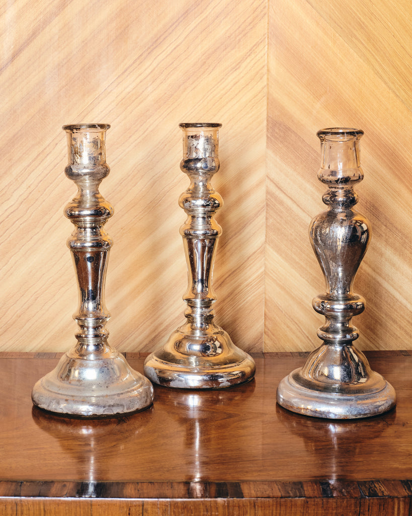 Elevate any setting with this exquisite set of three rare handblown antique glass candlesticks. Each candlestick showcases the artisan's skill, with a delicately crafted form that captures and reflect candlelight in a warm, glittering glow. These timeless candlesticks are perfect for creating an atmosphere of understated elegance, whether for intimate dinners, gatherings, or as a refined addition to your decor.