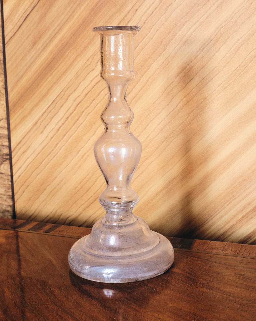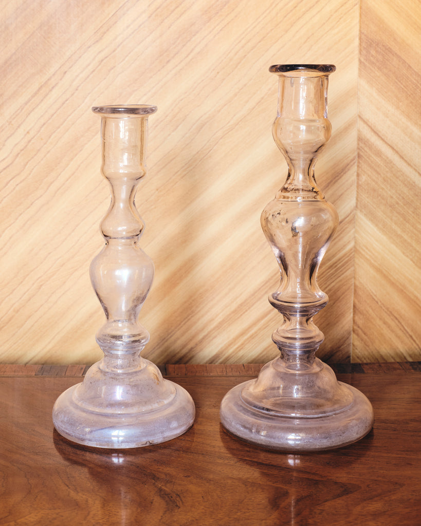 Elevate any setting with this exquisite set of two rare handblown antique glass candlesticks. Each candlestick showcases the artisan's skill, with a delicately crafted form that captures and reflect candlelight in a warm, glittering glow. These timeless candlesticks are perfect for creating an atmosphere of understated elegance, whether for intimate dinners, gatherings, or as a refined addition to your decor.