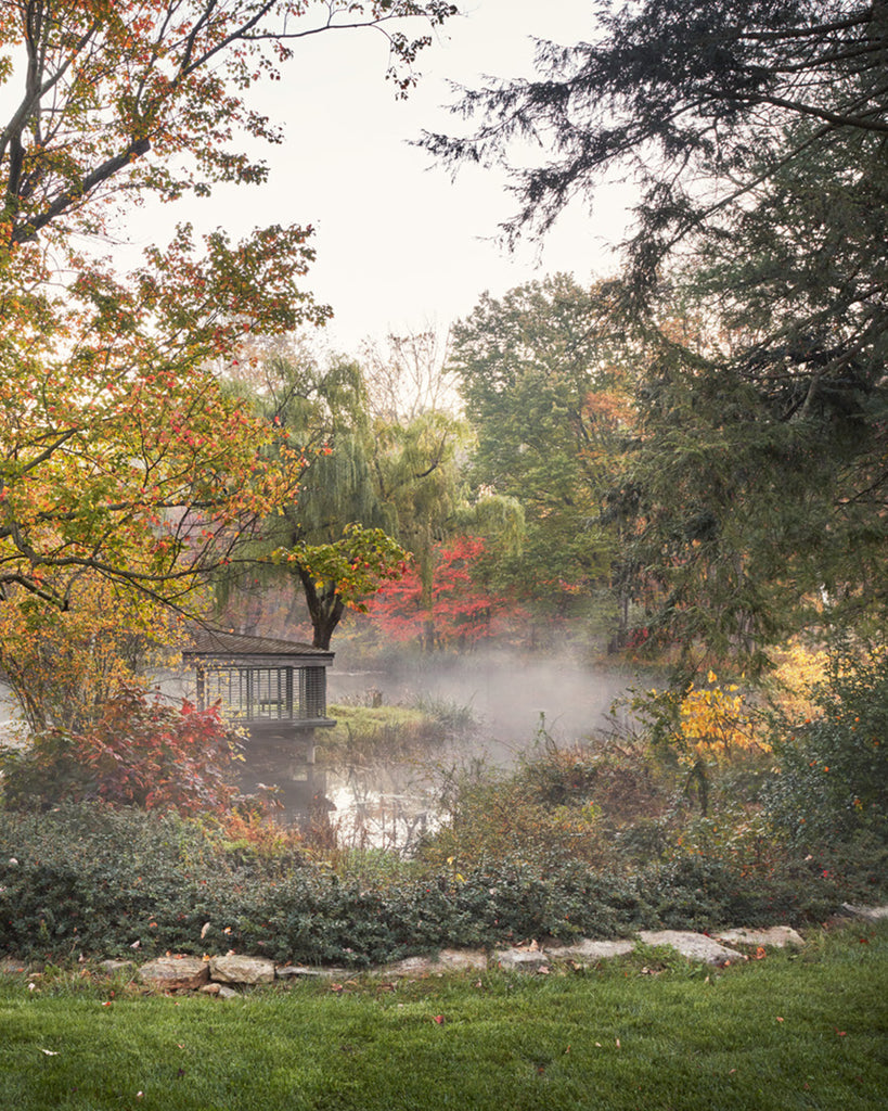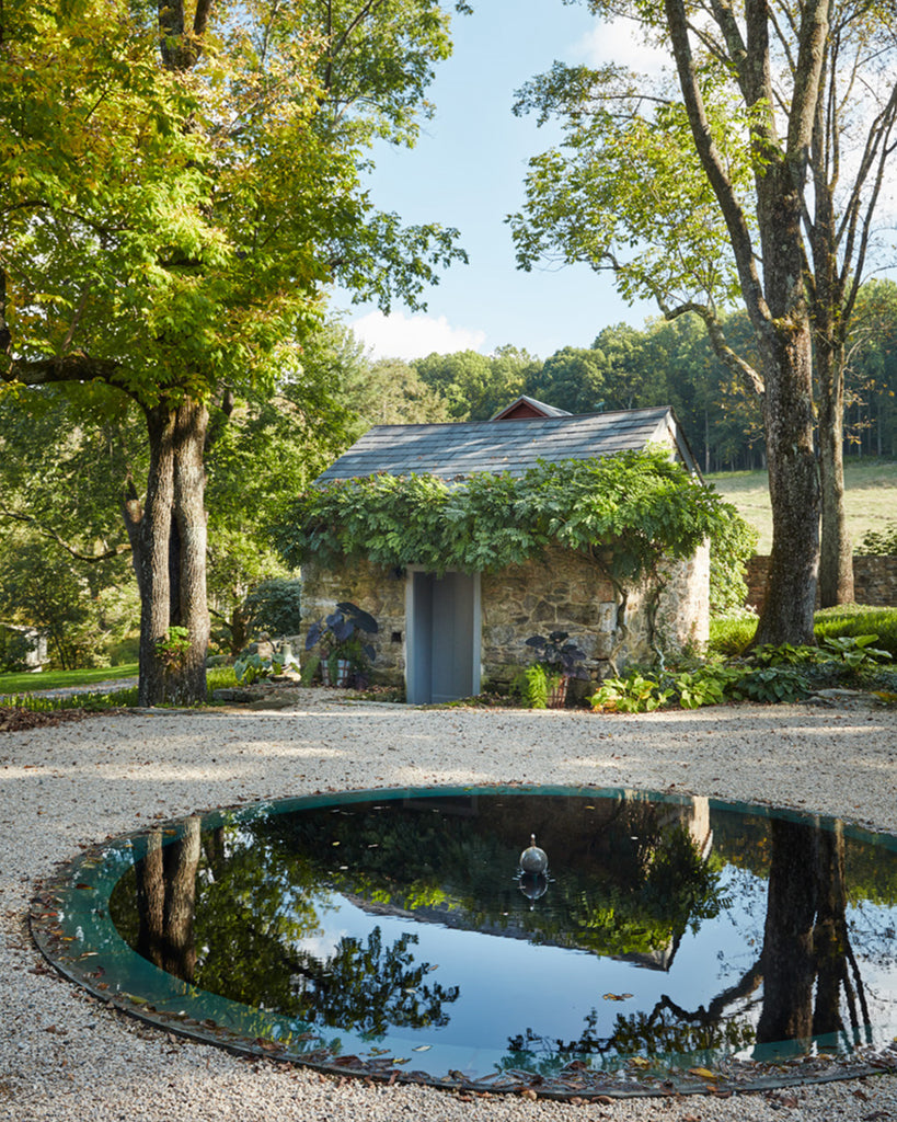 Preserving and enhancing a property rich in narrative and natural beauty has been a twenty-year obsession for this property’s owner. Mavec has called upon a host of well-known garden luminaries to help preserve what began as a farm with a solitary stone house originally owned by the publisher of the Nancy Drew mysteries while making it functional, productive, and beautiful for the twenty-first century. Today, a series of individual gardens rest within a natural hollow surrounded by native woodland, including a broad gathering space defined by whimsical cloud-pruned boxwood hedges, groves of lilacs, and dogwoods and hellebores that entice visitors into early-season walks with delicate color each spring, a stone-walled vegetable and flower garden whose geometry is inspired by medieval monasteries, winding perennial-lined paths, orchards that produce over five hundred pounds of apples each fall, a natural pond brimming with aquatic plants, and an elliptical hillside meadow farmed for hay. All lead intuitively back to the “town square,” an open area tucked among the dwelling spaces featuring a broad ground-level fountain that clearly identifies it as the true heart of the farm.