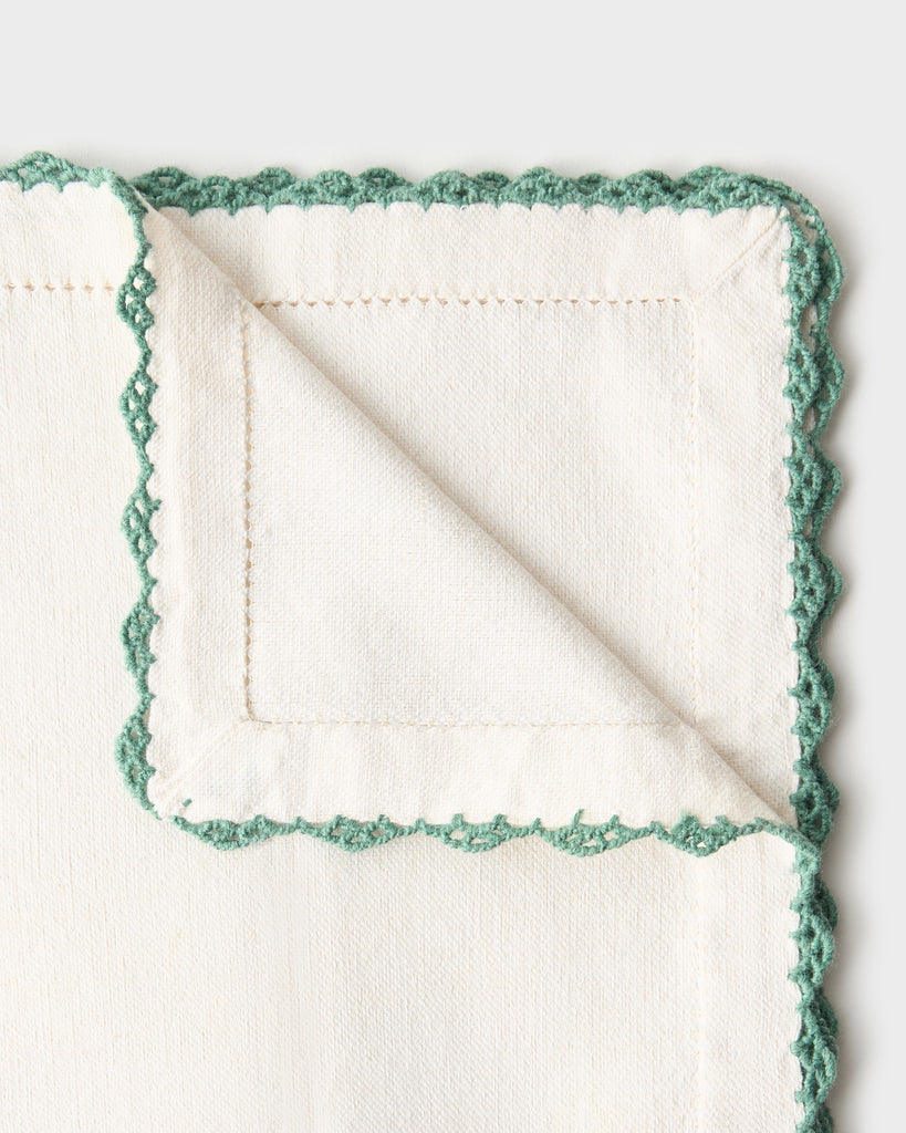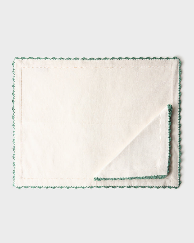 The Beatrice placemats are made of cotton and embellished with a green scalloped embroidery border. They are simple yet delightful, and will stand out against a brilliantly patterned table linen.