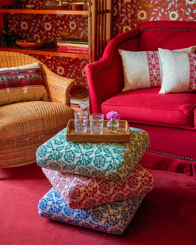Décors Barbares and Namay Samay share a deep love for the craft of textiles. Namay Samay loves the challenges of reproducing archival material, even if it means tie-dying different widths of yarn to achieve the effect of handmade pieces. Décors Barbares is known for its rich bohemian world conjured in layered prints as well as its commitment to quality. Together they have added a range of weaves, embroideries and prints inspired by the textile collection of Nathalie Farman-Farma. Shop the made-to-order collection exclusively at Cabana.