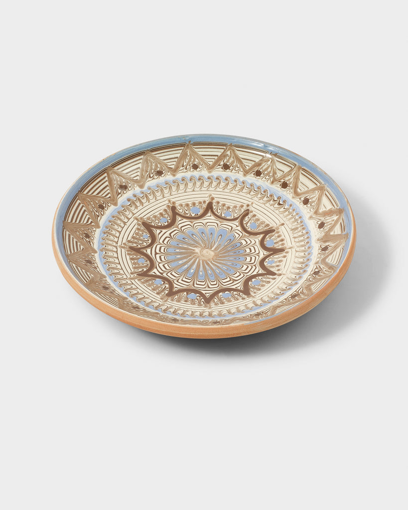 Horezu ceramics are a beautiful representation of the cultural heritage of Romania. Crafted entirely by hand, this plate features swirls of brown and blue combine to create a joyful sunburst pattern. Use them to create an autumn inspired table setting or hang them on the wall for a rustic decor. Slight variations in appearance are a testament to its artisanal nature.