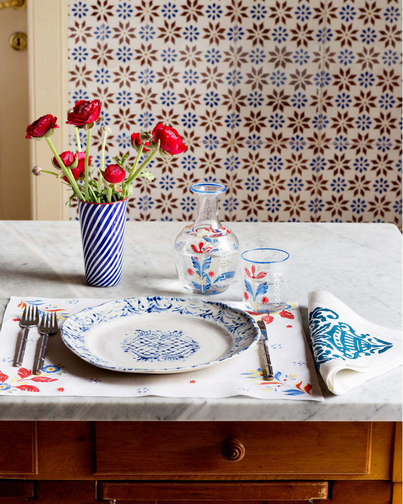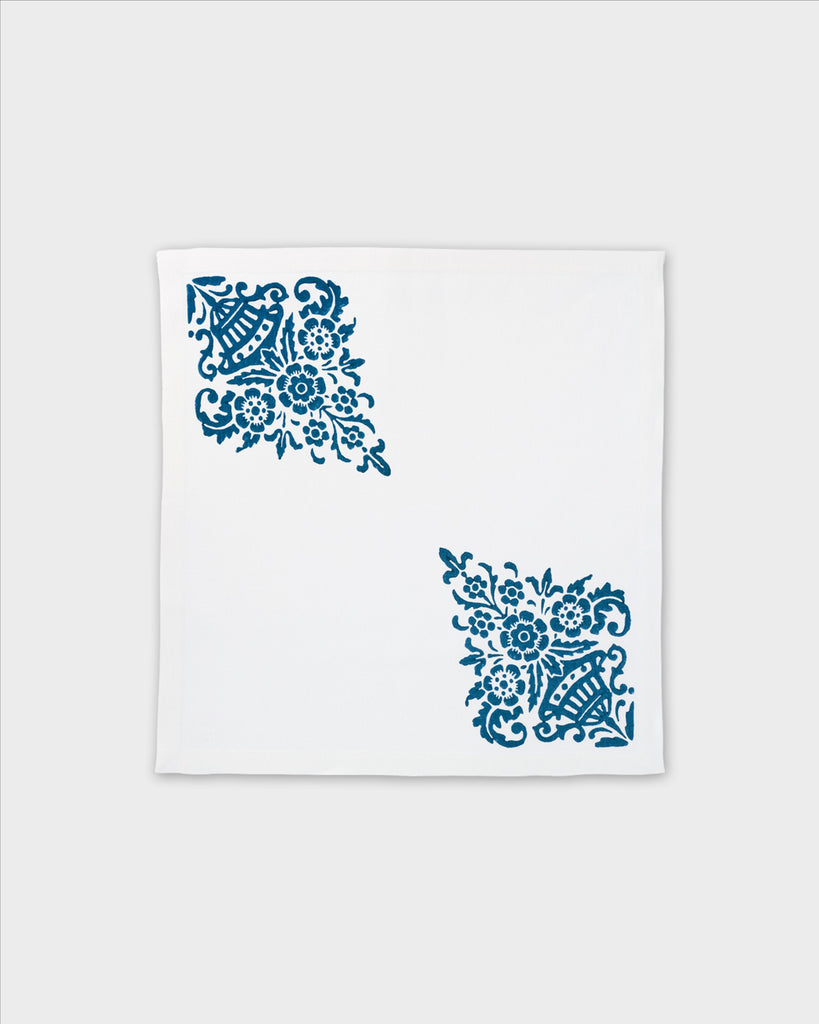These unique napkins are printed by hand using wooden blocks, an ancient tradition kept alive in Italy by a small cadre of master artisans. Made in Emilia-Romagna, the Mirandola napkin features an ornate floral motif that stands as a testament to the quality of historic craftsmanship. We believe they can be used in every imaginable setting, but are especially fond of pairing them with our Papyrus plates and Persian tablecloths. Set of 4.