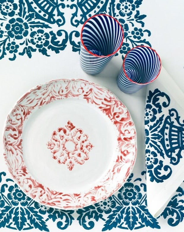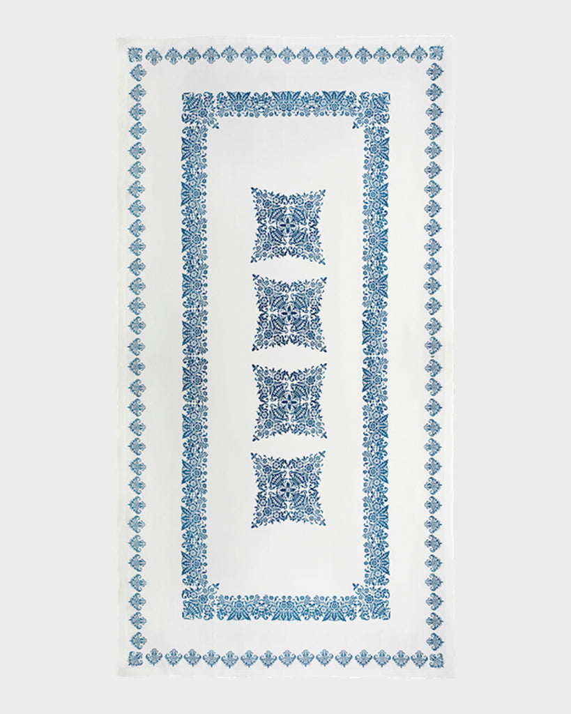 These unique tablecloths are printed by hand using wooden blocks, an ancient tradition kept alive in Italy by a small cadre of master artisans. Made in Emilia-Romagna, they feature a blue motif of classic floral ornaments in two borders around a central cluster, and stand as a testament to the quality of historic craftsmanship.
