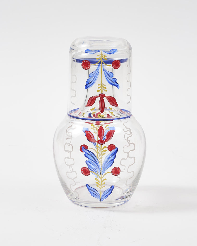This delightful carafe and glass set is handblown and hand-painted on the Venetian island of Murano, where master Italian glassmakers have practised their craft for centuries. Its elegant yet classic form is adorned with whimsically painted flowers in red, blue, white, and pale yellow. A blue rim at the top of the carafe adds a subtle touch of contemporary flair. We love setting them next to our beds or placing them on a table draped with one of our Hand-printed Linen Tablecloths and surrounded by our "Tribal" plates.