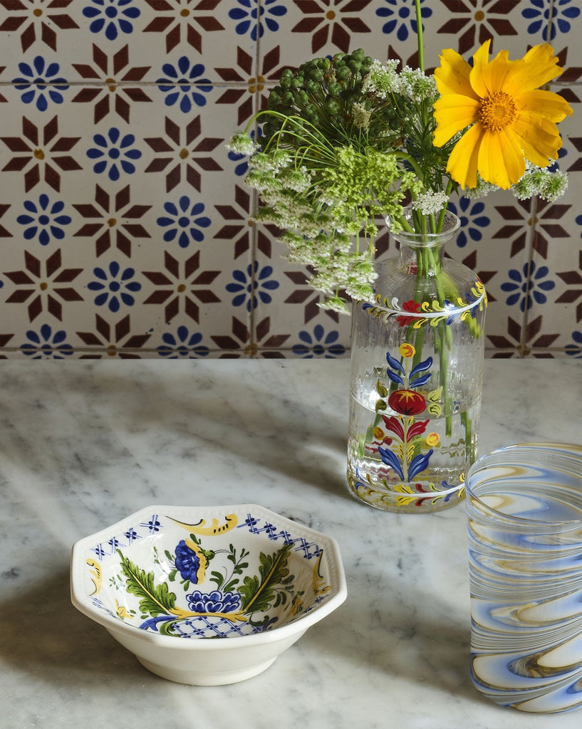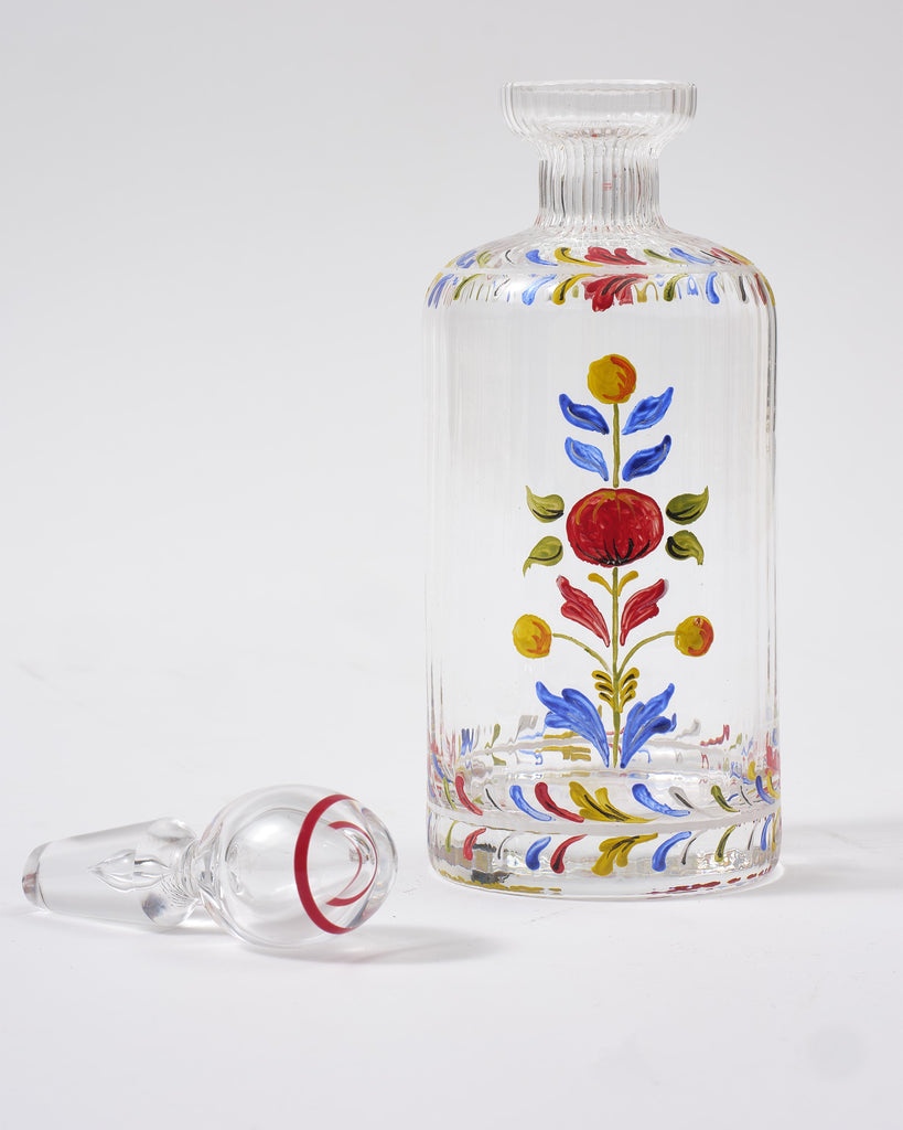 These charming glass bottles are hand-blown and hand-painted in Italy from the highest quality Venetian glass. Each one is decorated with a red, blue, and green floral motif inspired by historic textiles. The eclectic mélange of artisanship and design inspiration typifies the Cabana spirt, which always searches new juxtapositions of references while honouring the highest standards of craft and material. The bottle features a contrasting red rim, and is perfect as an oil bottle or as a tiny vase for flowers.