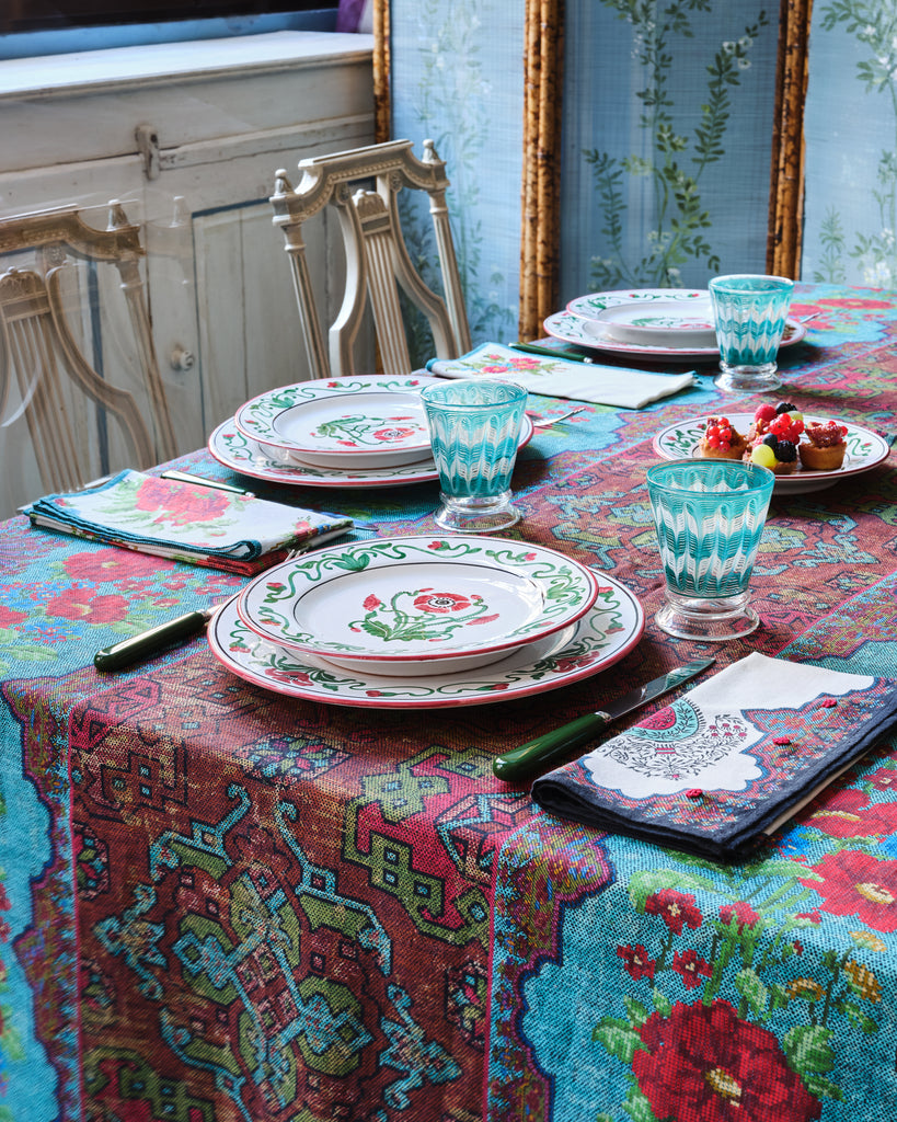 The Scheherazad tablecloth is 100% linen, featuring a striking ornate print inspired by the Arabian Nights folk tale narrated by the ancient ruler Sharyar's wife Scheherazade for One Thousand and One Nights. The combination of motifs from intricate carpets, brocades and fine embroideries with blooming florals results in a layered, sophisticated pattern, perfect for a lavish celebration. For the complete look, pair with our Jahangir linen placemats and Cyrus french-knot embroidered napkins.