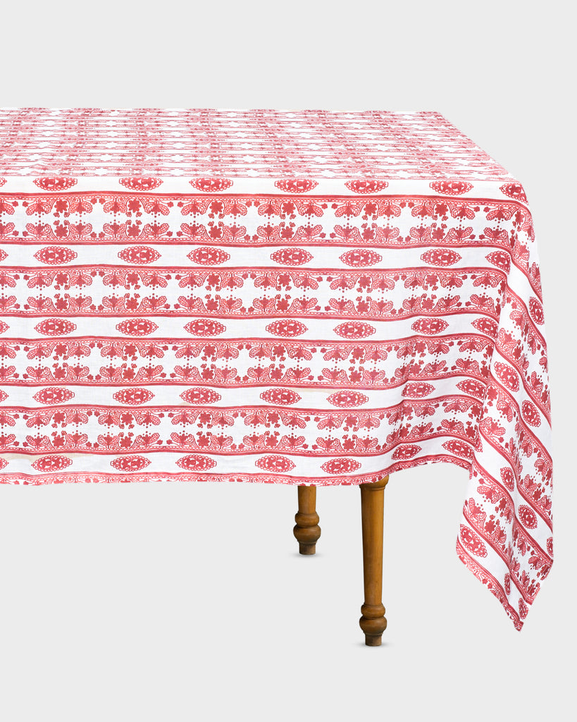 The Striped Floral Folk Tablecloth is printed on pure linen and is inspired by maker Zsuzsanna Nyul's Hungarian heritage. Featuring a red and white striped pattern with floral motifs emulating traditional Hungarian embroidery, it brings a touch of old-world charm and craft into any home. Pair it with matching napkins, a handwoven placemat and hand-painted plates for a rich and inviting table setting.