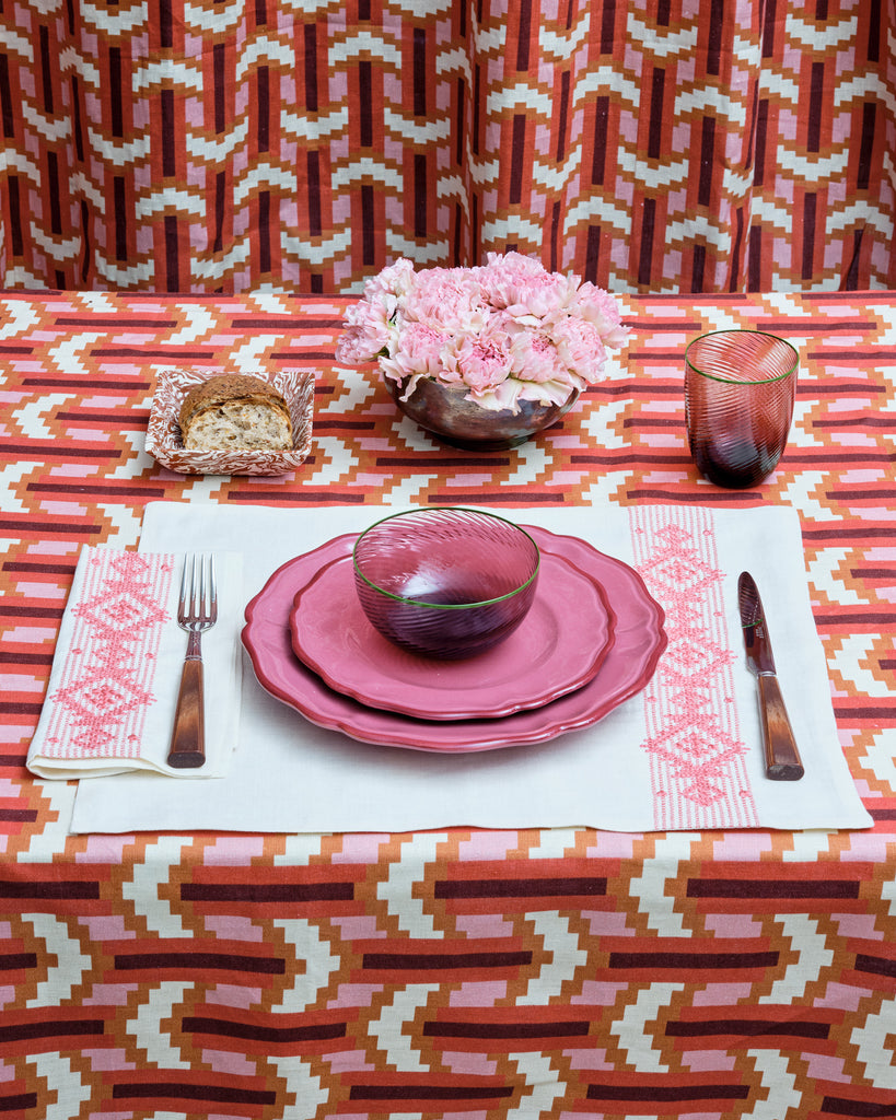 Inspired by traditional Vishyvanka embroidery, the Folklore Embroidered Placemat is handmade in Ukraine, featuring one striped border that frames the 100% linen placemat. Slight variations in finish or appearance are not considered imperfections, rather the mark of a unique handmade item.