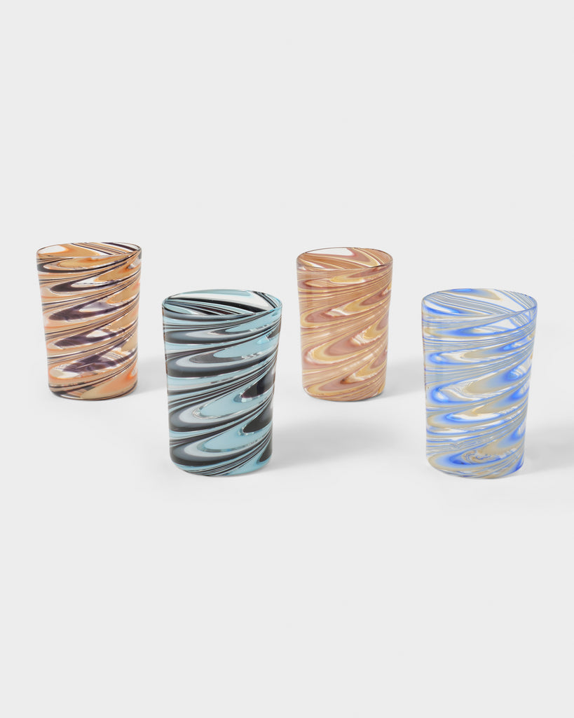 Hand-blown on Murano, the historic Venetian glassmaking island, and produced in collaboration with Laguna~B, these glasses feature an extraordinary marbled pattern in light blue. They represent an exciting marriage of traditional artisanship with contemporary innovation, and will add a splash of warmth to your table or sideboard.