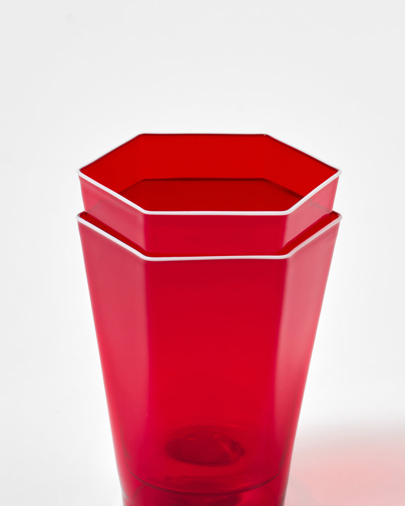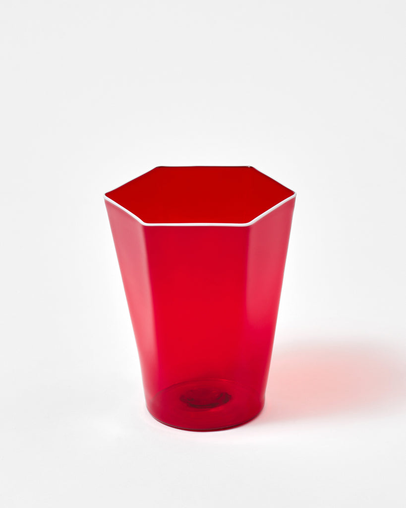 Crafted in the age old Venetian center of glassmaking, the Giberto hexagonal glasses are a testament to the skillful artisanship of Murano glassmakers. Exuding refinement, the glasses combines geometric forms, a silhouette of sharp lines marked by a hexagonal top rim and circular base. Its ultra light weight body will continuously delight both you and your guests. Sold as a set of six glasses, each with a different colorful rim. Set of Six