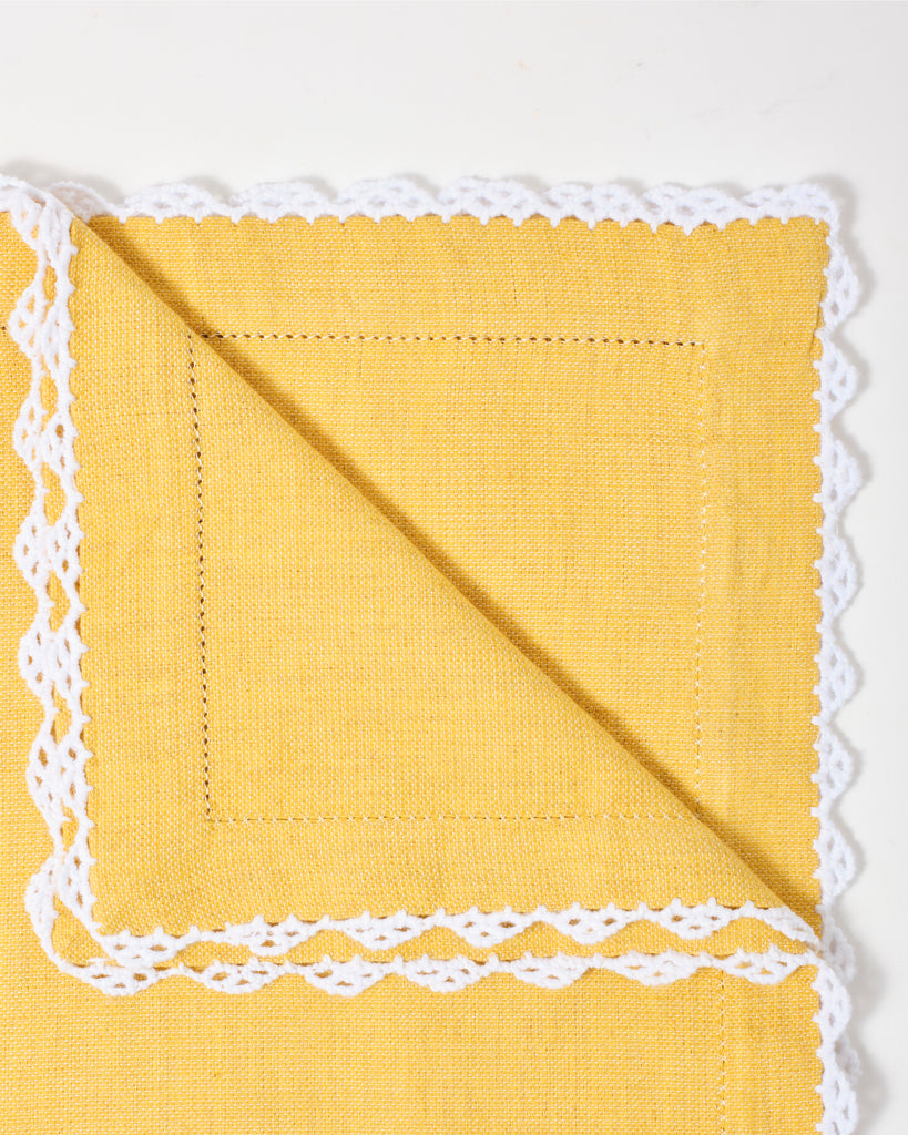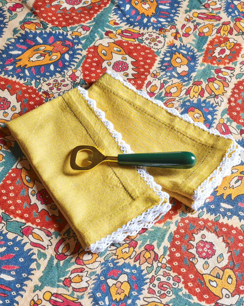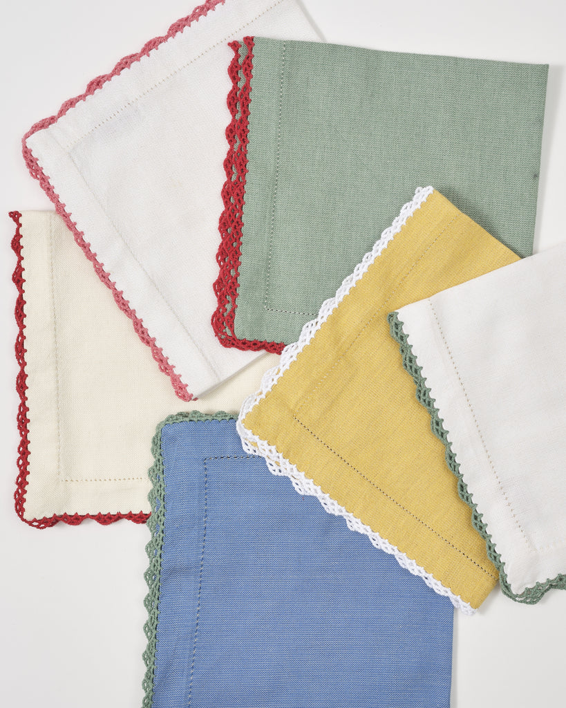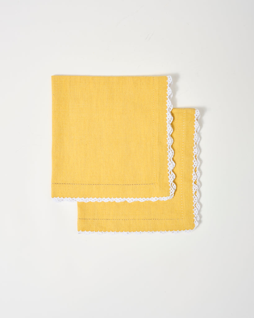 The Beatrice napkins are made of cotton and embellished with a white scalloped embroidery border. They are simple yet delightful, and will stand out against a brilliantly patterned table linen. Set of 2.