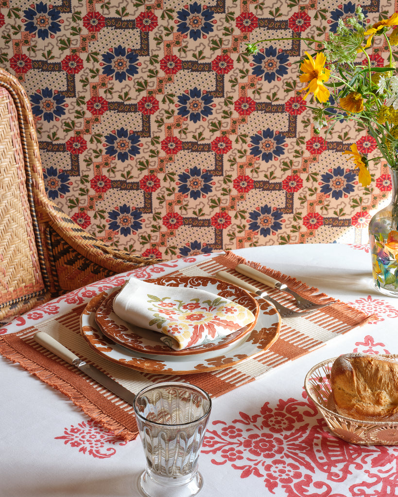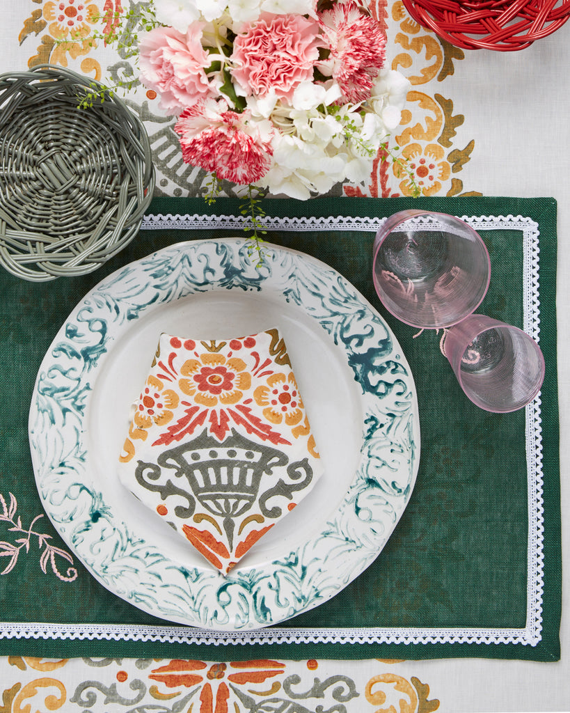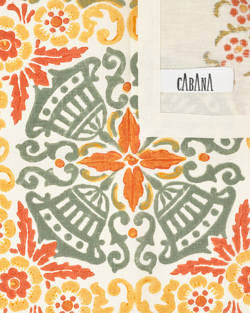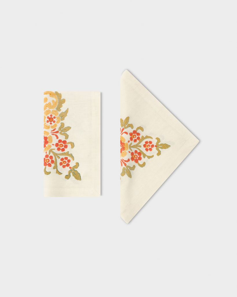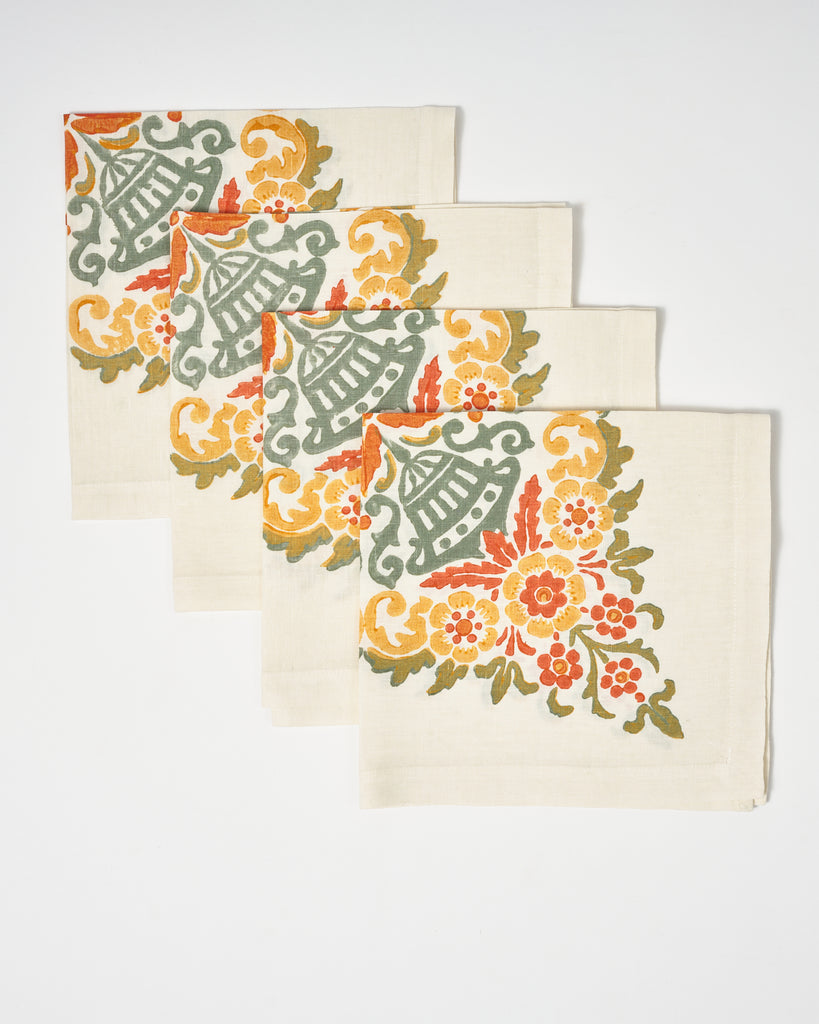The Mirandola napkin features a hand-stamped central pattern in subtle shades of green, red, and gold. Its edges are further adorned with two repeating floral motifs. We at Cabana love these napkins for the exquisite craftsmanship they display in such stylish evidence. Perfect for either formal dinners or casual lunches with friends, the Mirandola Napkins are sure to delight all seated around it. Set of 4.